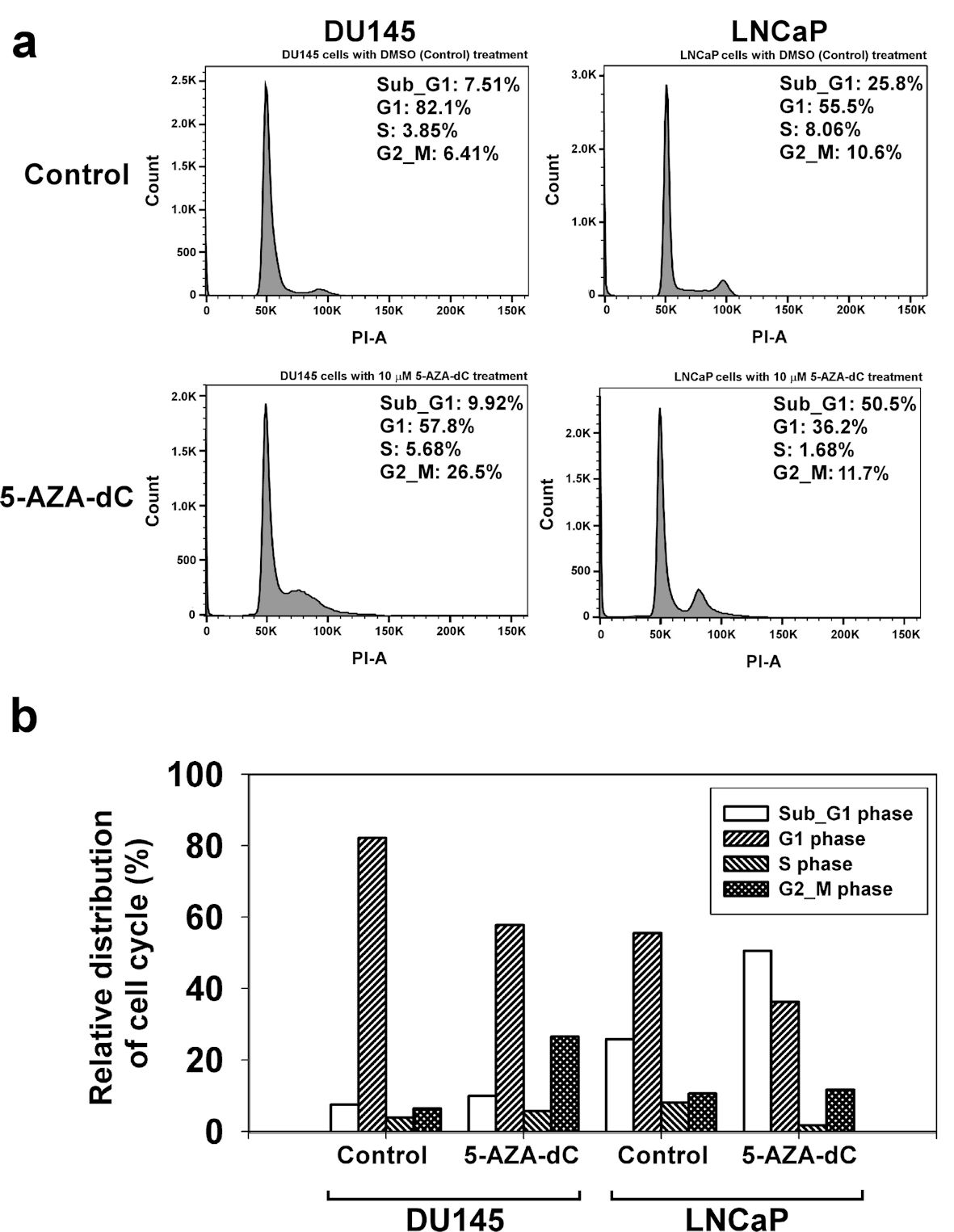 To explore the effects of 5-AZA-dC on the cell cycle process, DU145 and LNCaP cells were treated with 10 µM of 5-AZA-dC for 72 h, and DNA of cells was stained with PI. Then, DNA contents in different cells were examined using flow cytometry assay, and cell cycle process of the cells was analyzed by FlowJo software. The results showed that treatment with 5-AZA-dC markedly increased the accumulation of cells at the Sub-G1 phase from 25.8% to 50.5% in LNCaP cells especially (Fig. 6a). Also, treatment with 5-AZA induced DU145 cells from G1 phase to G2/M phase, with G1 phase from 82.1% to 57.8% and G2/M phase from 6.41% to 26.5%, which blocked the cell cycle progression at G2/M phase (Fig. 6a). Our data revealed that the treatment of 5-AZA-dC affected cell cycle process in DU145 and LNCaP cells in different manners (Fig. 6).