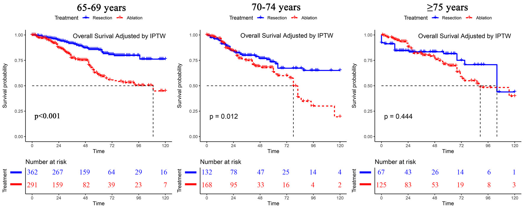 Conclusion: With increasing patient age, the treatment outcomes of ablation become similar to those of resection. A higher liver/other cause-related death rate in very elderly patients may shorten the life expectancy, which may lead to the same OS regardless of whether resection or ablation is chosen.