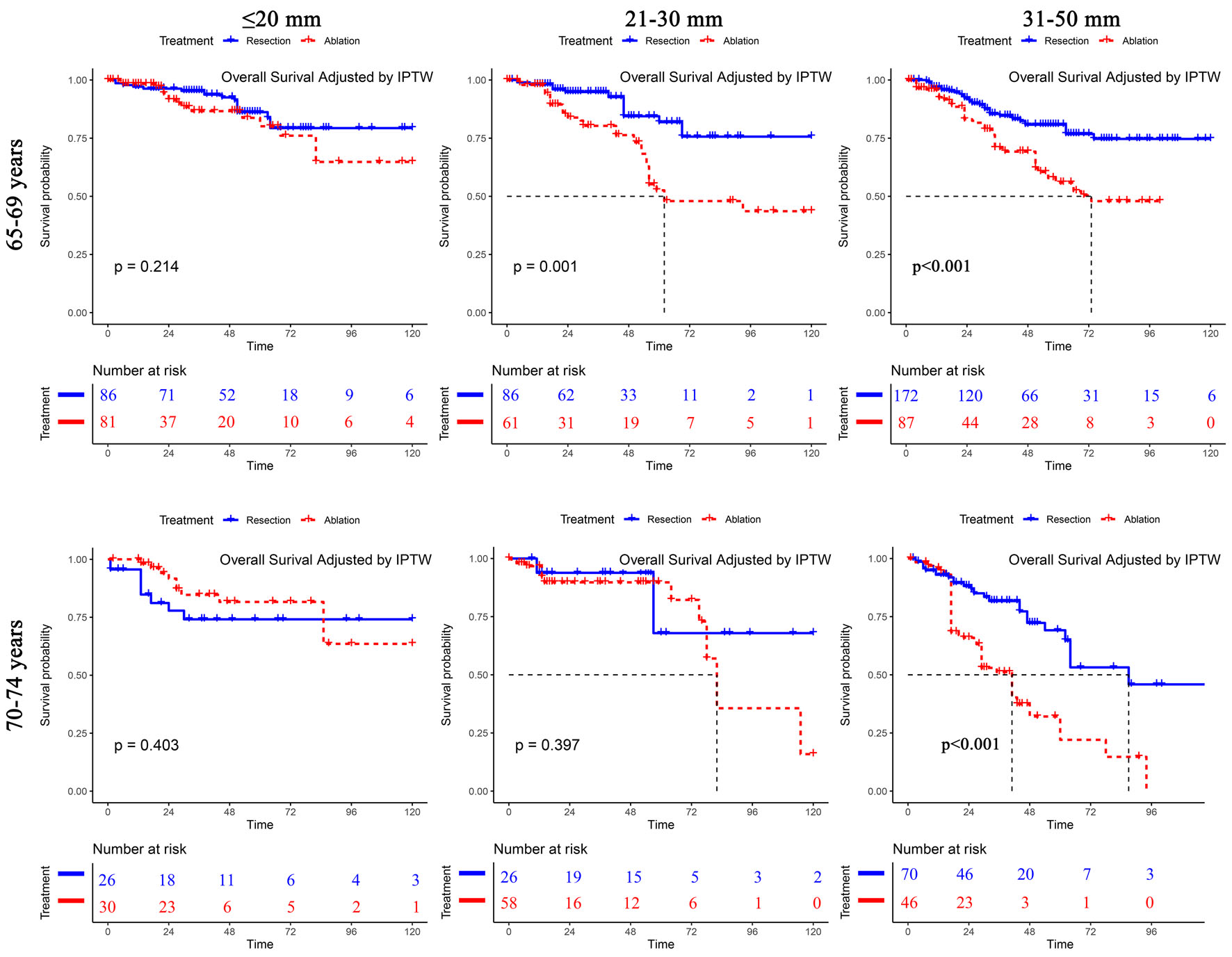 The characteristics of patients who underwent ablation and resection were compared using the Chi-squared test (Fisher’s exact test for small sample) for categorical variables and Student’s t-test for continuous variables. Heterogeneity of treatment effects was assessed with tests of interaction between treatments (ablation vs. resection) and age groups (65 - 69, 70 - 74 and ≥ 75). Hazard ratios (HRs) and 95% confidence intervals (CIs) of survival in response to treatment across the different age groups were estimated. Multivariate analyses were performed using Cox proportional hazards regression analysis with a stepwise backward process. The Kaplan-Meier method with a log-rank test was applied to compare the survival outcomes of patients. An estimation of the median follow-up time was proposed with the reverse Kaplan-Meier method. All statistical tests were two-sided, and P < 0.05 was considered statistically significant. For all analyses, HRs with 95% CIs were calculated. All statistical analyses were performed using SPSS 23.0 for Windows (SPSS, Chicago, IL, USA) and R software (version 3.6.2) with the rms, survival, ggplot2, survminer, IPWsurvival and MatchIt packages.