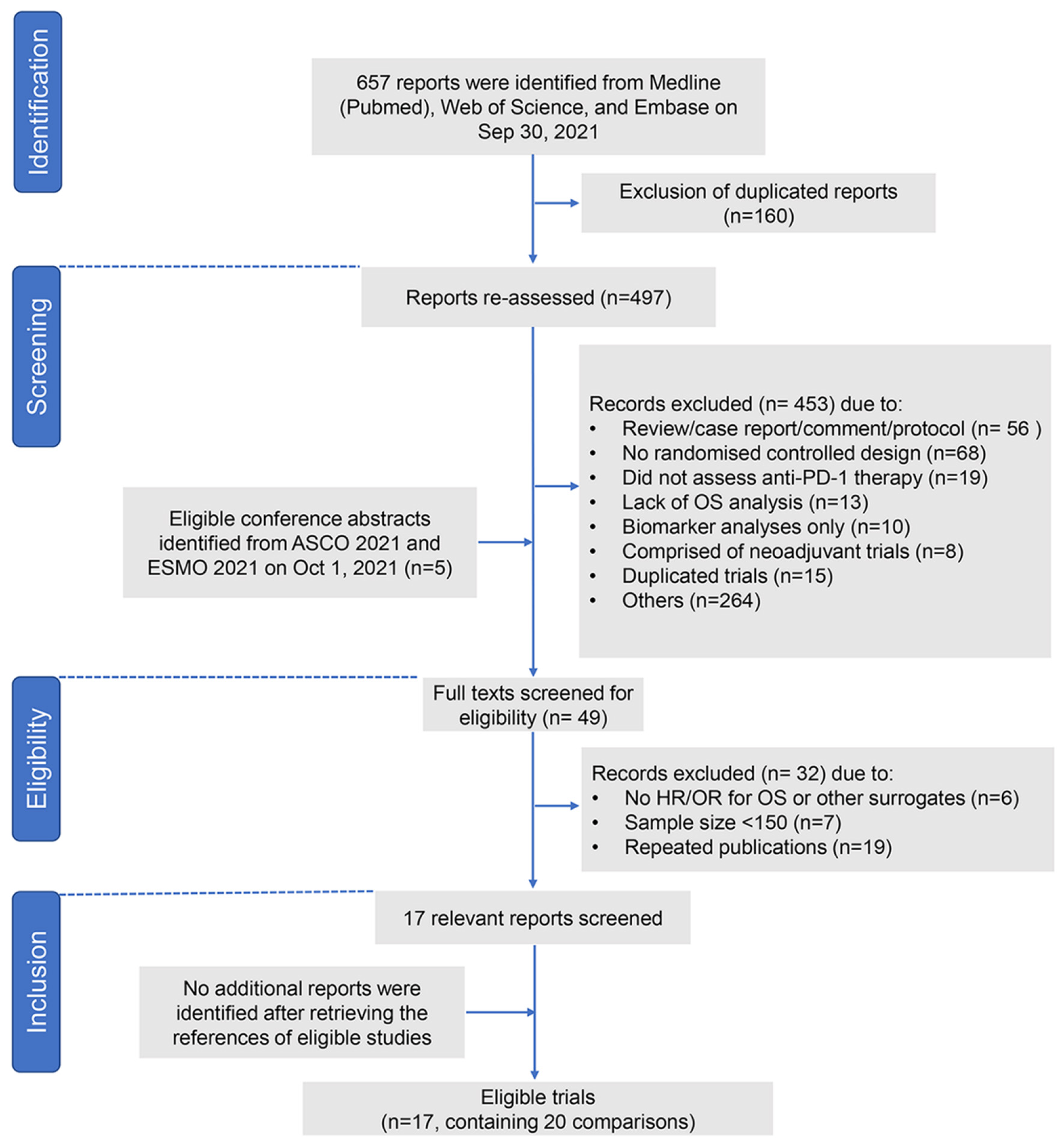 Two authors (RCN and YW) independently searched Medline (PubMed), Web of Science, Embase, ClinicalTrials.gov and Cochrane Library databases for eligible trials from January 1, 2000 to September 30, 2021, using the following search terms: nivolumab, pembrolizumab, avelumab, atezolizumab, durvalumab, PD-1, PD-L1, checkpoint inhibitors, gastro-esophageal carcinoma and randomized controlled trial. Supplementary Material 1 (www.wjon.org) shows the detailed search terms. Randomized controlled trials (RCTs) investigating anti-PD-1/programmed death ligand-1 (PD-L1) therapy in advanced GE carcinoma that reported treatment effect (hazard ratios (HRs)/odds ratios (ORs)) on OS and surrogate endpoints (PFS/ORR/DCR) were included. We excluded reviews, abstracts, case reports and studies with sample size less than 150 subjects. Conference abstracts of the 2021 American Society of Clinical Oncology (ASCO) annual meeting and the European Society for Medical Oncology (ESMO) Congress 2021 were manually searched to retrieve eligible trials.