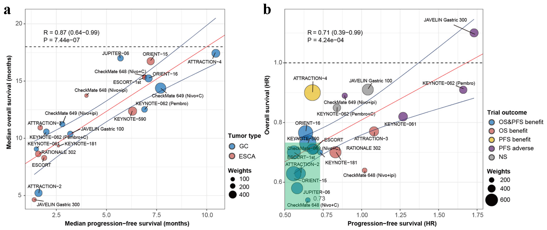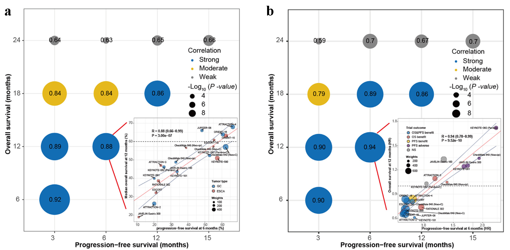 In future IO trial, interest could be focused on predicting the treatment effects on OS by observing the effects on PFS at earlier time points. Kok et al reported that 6-month PFS could effectively predict 12-month OS in IO trials [47]. Similarly, our study found that 3-month PFS could reliably predict 6-month OS, 6-month PFS could reliably predict 12-month OS, and 12-month PFS could reliably predict 18-month OS in IO trials of advanced GE carcinoma. However, we noted weakened correlations between HRPFS and HROS as the follow-up duration increased. We considered that this phenomenon could be mainly attributed to the disproportionate increase of HRPFS and HROS because of delayed responses in the experimental arms.