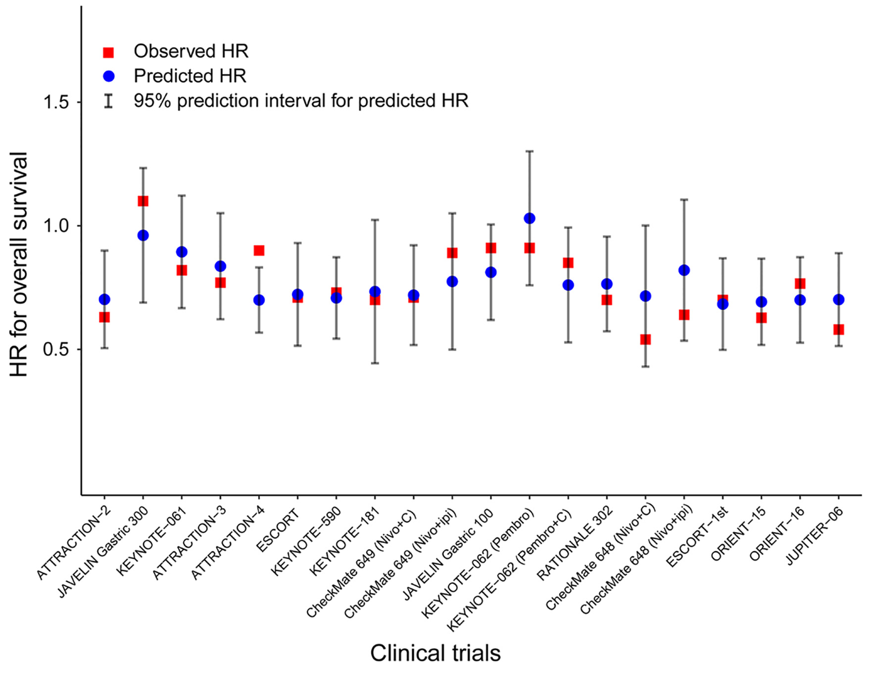 Further, leave-one-out cross-validation analyses were performed to evaluate the accuracy of PFS in predicting OS. It was noted that the observed HR for OS fell within the 95% prediction intervals in 19 of 20 comparisons, indicating that the treatment effect on PFS could be a potential predictor of OS (Fig. 3).