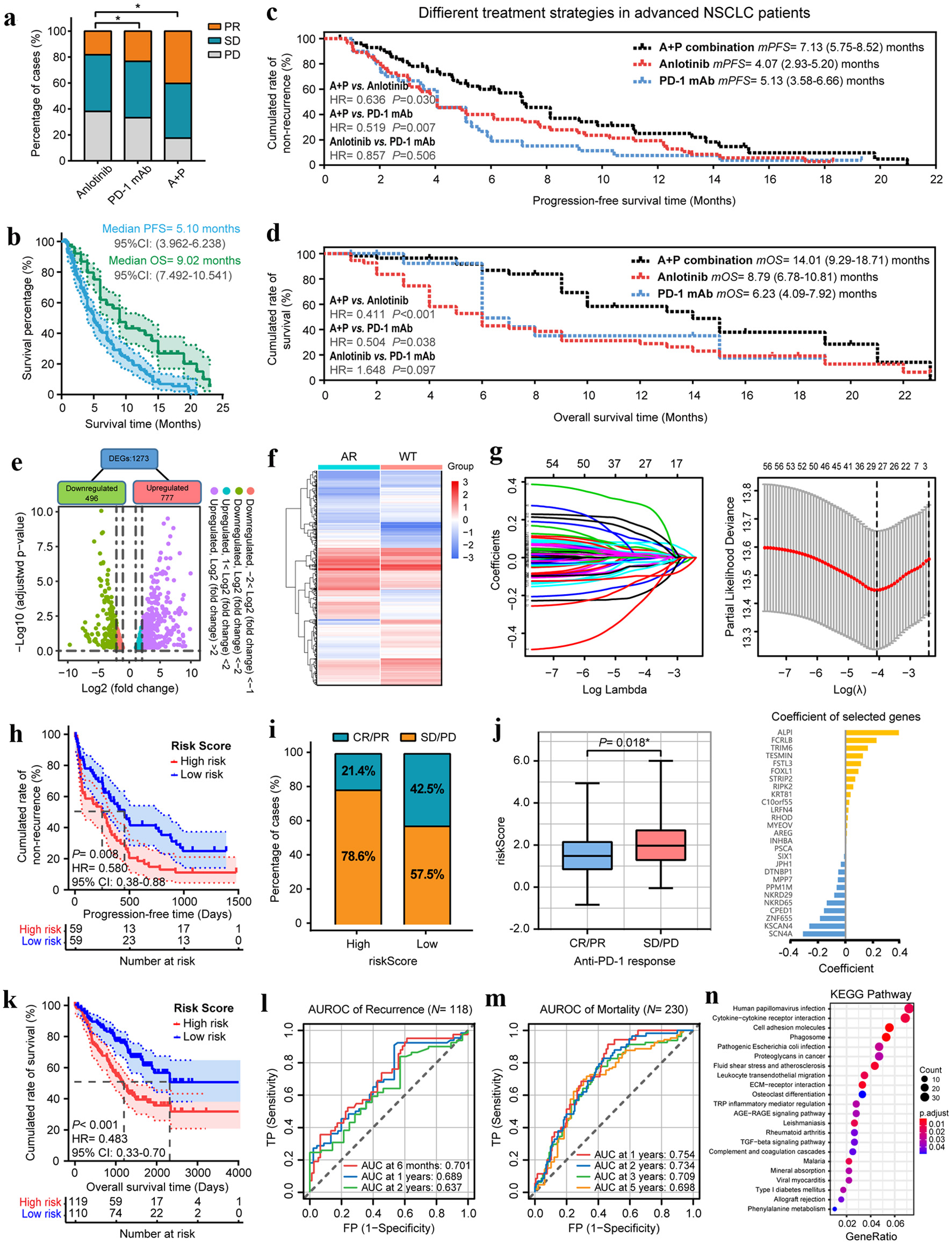 Based on the short-term and long-term analyses of five NSCLC immunotherapy datasets downloaded from the GEO database, we found that the modification of the lung TME by anlotinib may play a role in promoting the therapeutic effect of anti-PD-1 mAb. Figure 1h, k shows that the PFS and OS of the high-risk group were significantly shorter than those of the low-risk group. The ORR of the high-and low-risk groups were 21.4% and 42.5%, respectively (Fig. 1i). Patients who achieved an objective response also had a lower risk score than those who did not respond to treatment (Fig. 1j). Ultimately, the ROC curves and the results of AUCs in Figure 1l, M indicated that the ARIM-score was a promising prognostic indicator for mortality and recurrence in patients with NSCLC who received anti-PD-1 immunotherapy.