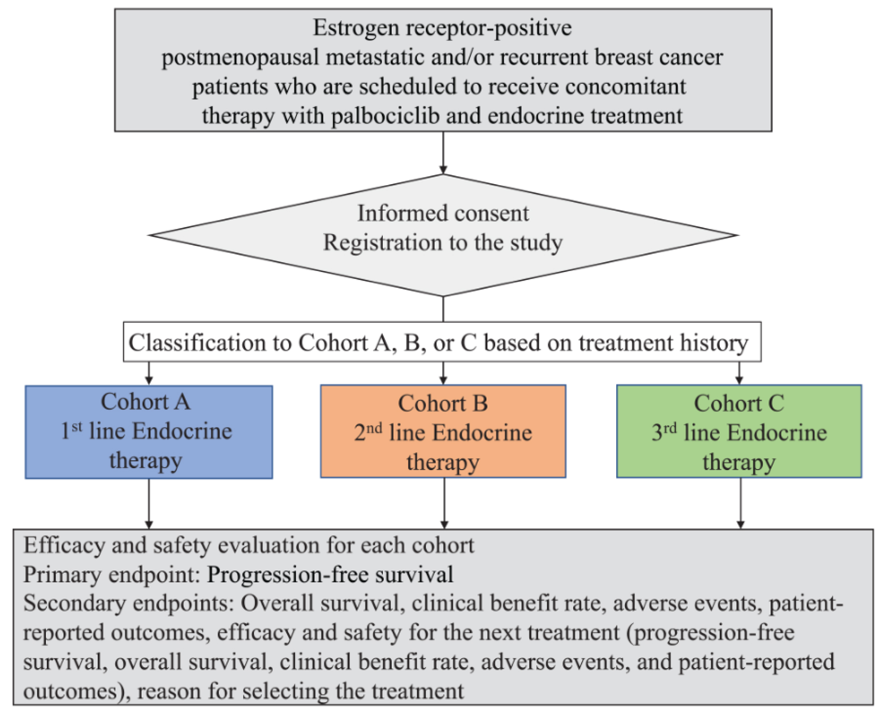We plan three cohorts based on the line of endocrine treatment as follows: 1) cohort A with first-line treatment; 2) cohort B with second-line treatment; and 3) cohort C with third-line or later-line treatment. According to the rationale described subsequently, the planned sample size is 700 cases in which 340, 200, and 130 cases belong to cohorts A, B, and C, respectively.