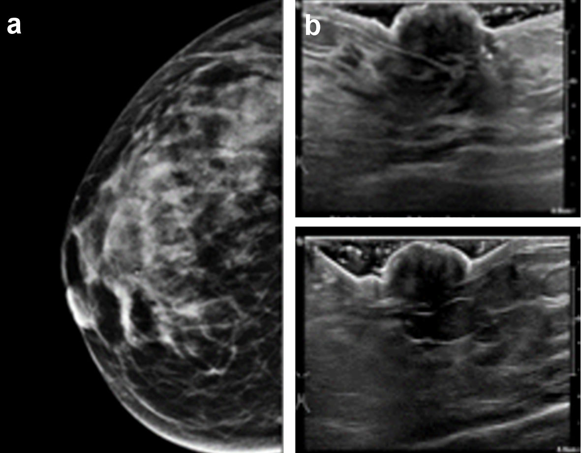 Mammography and targeted ultrasound were unremarkable (Fig. 2a, b). Breast magnetic resonance imaging (MRI) showed asymmetric enhancement of the right nipple (Fig. 3). Nipple excision vs. fine needle aspiration vs. incisional nipple biopsy were reviewed with the patient. After almost 2 years of watchful waiting and expectant management patient with ongoing complaints of nipple pain, she elected for excisional biopsy of her right nipple. Preoperatively, she met with plastic surgery to discuss delayed reconstruction.