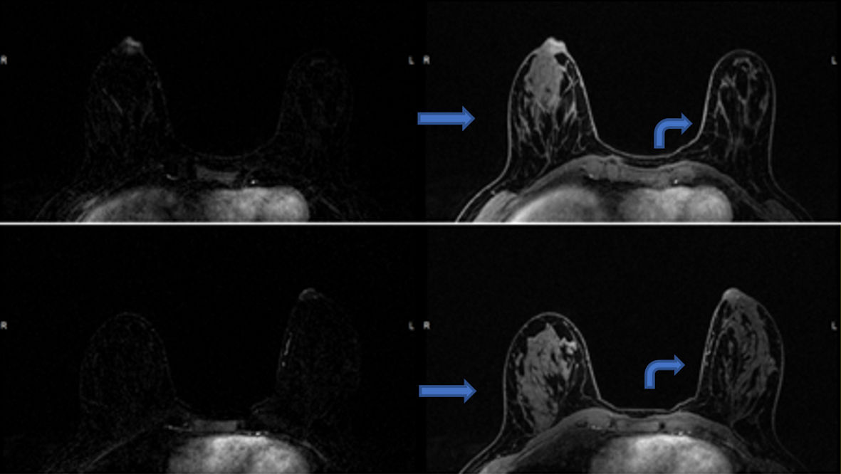 ![]() Click for large image | Figure 3. Post-contrast T1-weighted fat-suppressed axial MRI images, with subtractions on the left, show asymmetric enhancement of the right nipple (arrows) compared to the left (curved arrows). MRI: magnetic resonance imaging. |
