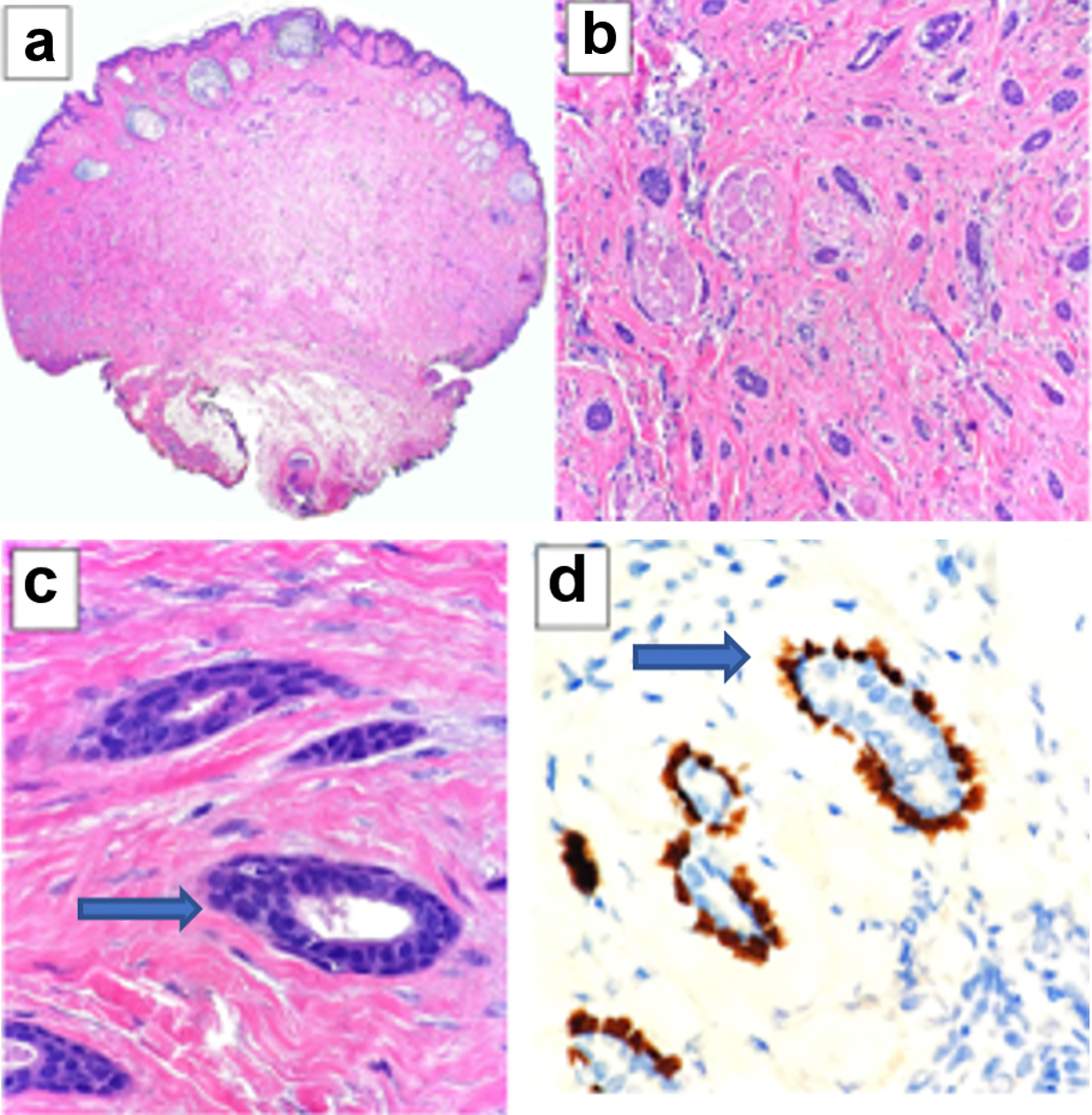 Histopathology revealed an infiltrative epithelial tumor growing through the dermis, infiltrating through bundles of areolar smooth muscle with focal perineural invasion (Fig. 4a-d). Superficially, the tumor contained dilated keratinaceous cysts that transitioned into squamous nests. Deeper in the specimen, the tumor formed ductal structures, some having a syringoid appearance and many showing compressed lumens. Cytologically, these cells were bland and contained only one to two mitoses per 10 high-power fields. The ducts had a retained peripheral myoepithelial layer that was stained by p40 and smooth muscle actin (SMA). There was no evidence of carcinoma in situ. Retention of the myoepithelial layer, superficial location, and lack of atypia distinguish syringomatous tumor from adenosquamous carcinoma. This pathology is like microcystic adnexal carcinoma of the skin, another rare entity, a low-grade sweat gland carcinoma that is typically seen in the head and neck region.