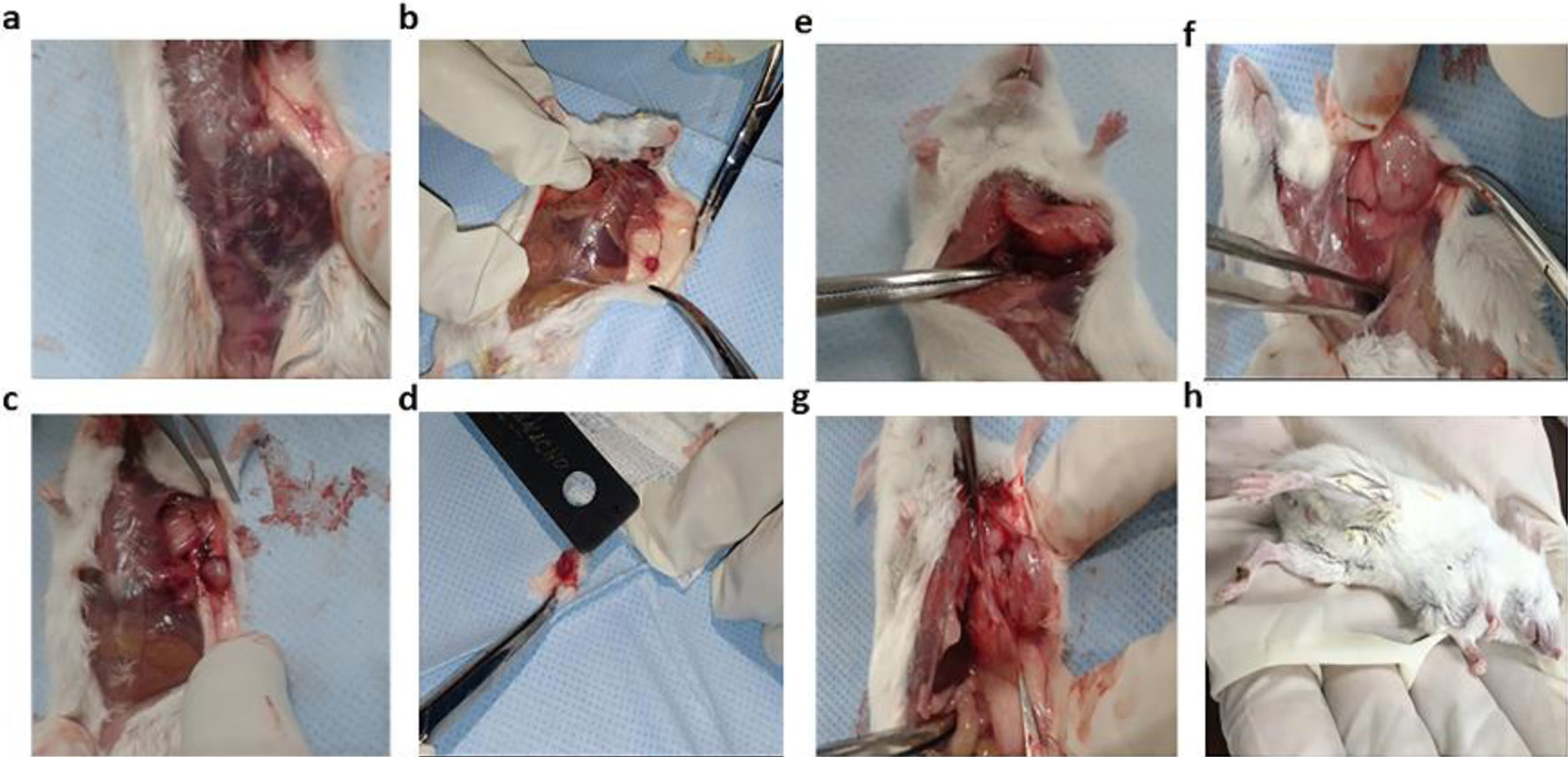 ![]() Click for large image | Figure 1. Macroscopic changes observed as the breast tumor grew in male BALB/c mice after injection with 4T1 cells: (a, b) first-week animals; (c, d) second-week animals; (e, f) third-week animals; (g, h) fourth-week animals. The tumor was clinically observable from the first week. The largest tumors were obtained at the fourth week. |