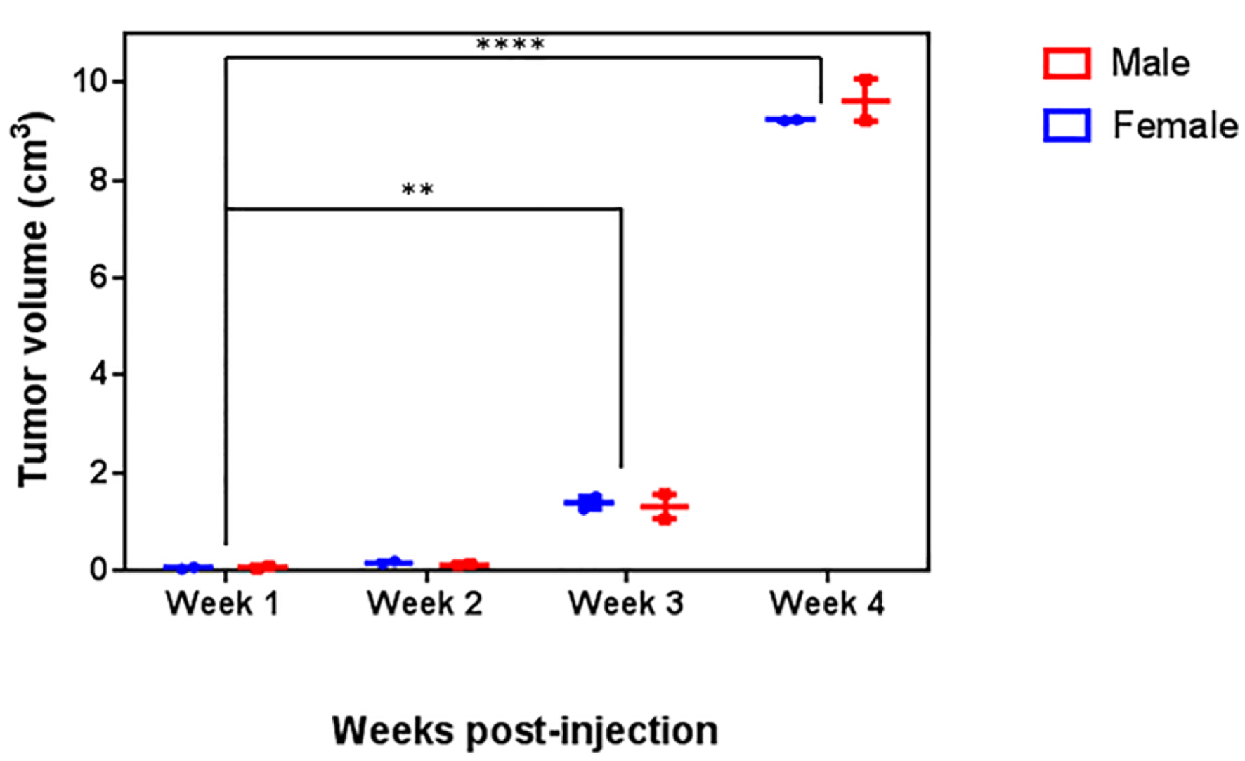 ![]() Click for large image | Figure 2. Analysis of tumor volume. Male and female BALB/c mice were inoculated with 4T1 cells. Tumor volume was recorded for 4 weeks. A two-way ANOVA followed by a Dunnet’s multiple comparisons test was carried out to compare the tumor growth; no significant differences in the tumor volume between male and female mice were observed (P = 0.1966) at any time point. |