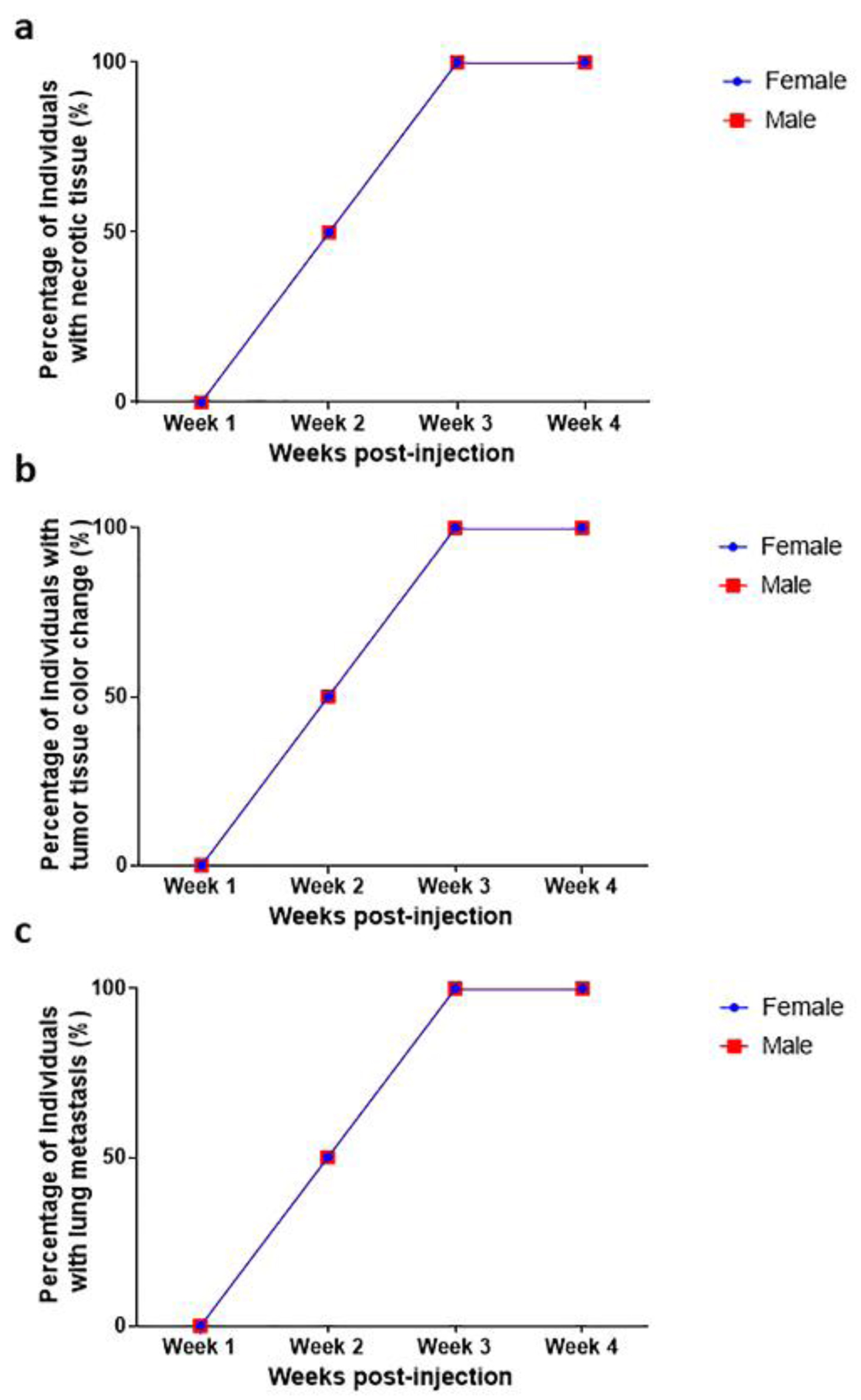 A two-way analysis of variance (ANOVA) test, followed by Dunnett’s multiple comparison tests, was performed to analyze the tumor growth per week. Mann-Whitney tests were used to study the association between tumor volume and necrosis. Relationships between necrosis and color change or lung metastasis development were established through Fisher’s exact tests. A two-way ANOVA statistical analysis was used to study the effect of time (weeks post-injection) and the sex of the animals on necrosis development and color change. Chi-square tests were used to determine the relationship between the time (weeks post-injection) and the presence of metastasis in different organs. All statistical analyses were performed using the software GraphPad PRISM v7.0.