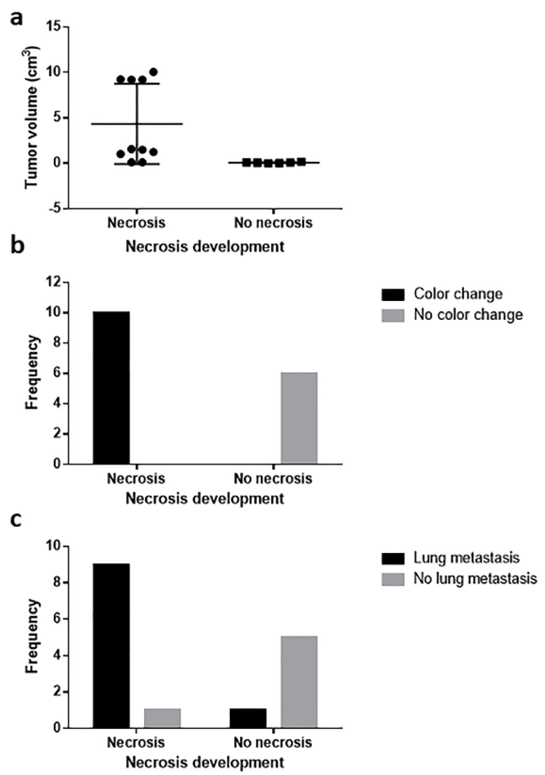 ![]() Click for large image | Figure 4. Relationship between necrosis development and (a) tumor volume, (b) tissue color change, and (c) lung metastasis. Tumor volume correlated with necrosis development, and necrosis was related to tissue color change and lung metastasis. |
