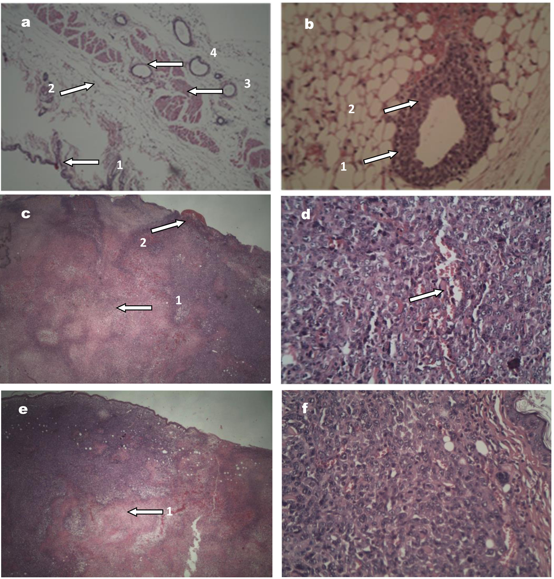 ![]() Click for large image | Figure 5. Images of tumors stained with hematoxylin and eosin. (a) Normal breast tissue (× 10; × 20 and × 40), showing (1) healthy skin, (2) fatty tissue, (3) muscle tissue, and (4) mammary duct with a cell monolayer. (b) Tumor tissue (× 40) corresponding to a premalignant lesion: (1) the duct is observed with various epithelial cell layers, (2) modifications in the nuclei. (c) Female mouse tumor tissue (× 20), showing (1) area of central necrosis and (2) skin ulceration. (d) Female mouse tumor tissue (× 40), the tumor in more advanced stages, with an area of lymphovascular infiltration. (e) and (f) correspond to tumor tissue in male mouse, × 20 and × 40, respectively, with similar features to the female tumor tissue. |