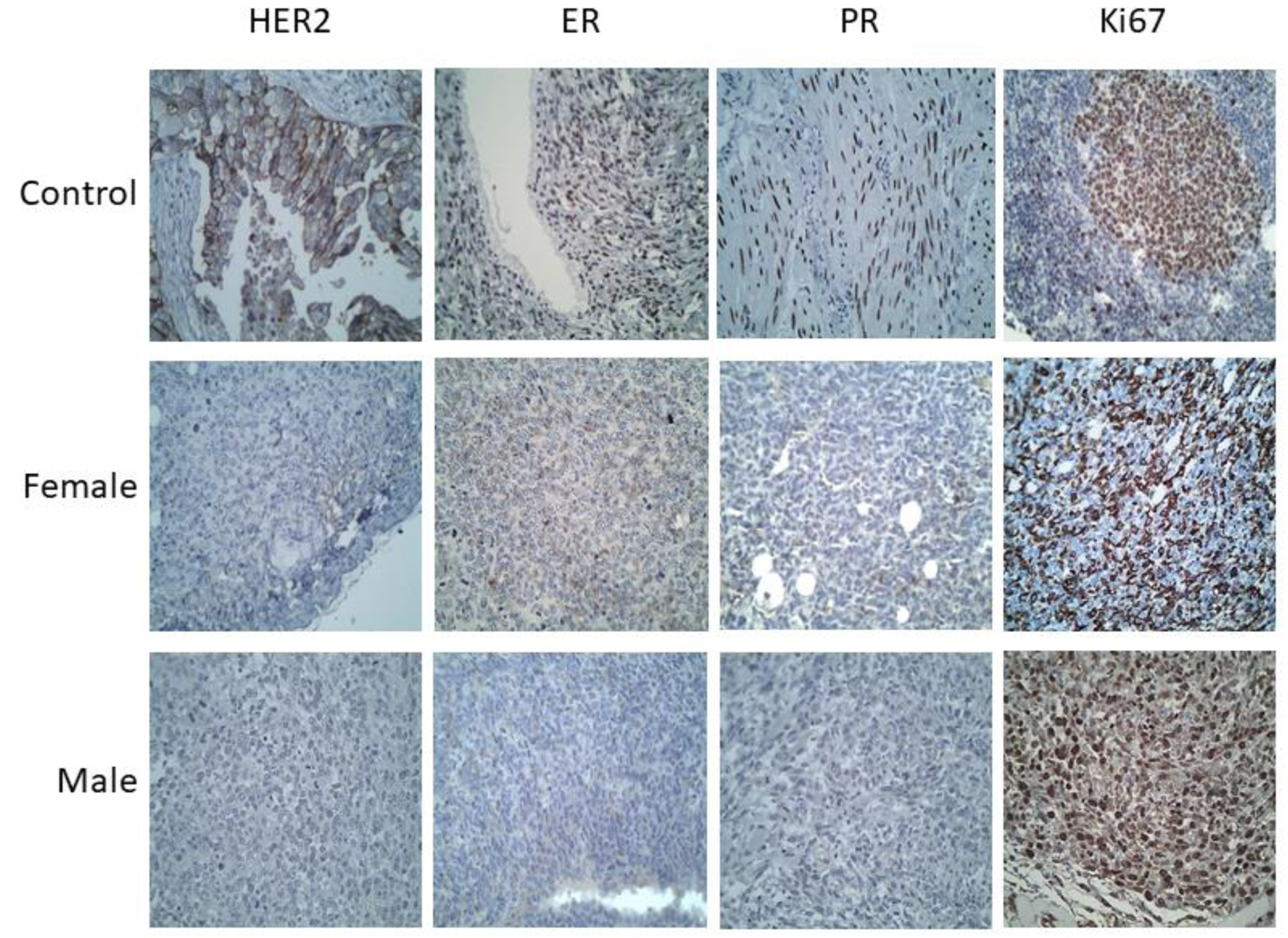 Immunohistochemistry analysis showed that the molecular expression patterns in the tumors of both male and female animals corresponded to ER-/PR-/HER2-/Ki67+ (Fig. 6), which corroborates that for both sexes the tumor had triple-negative features [13].