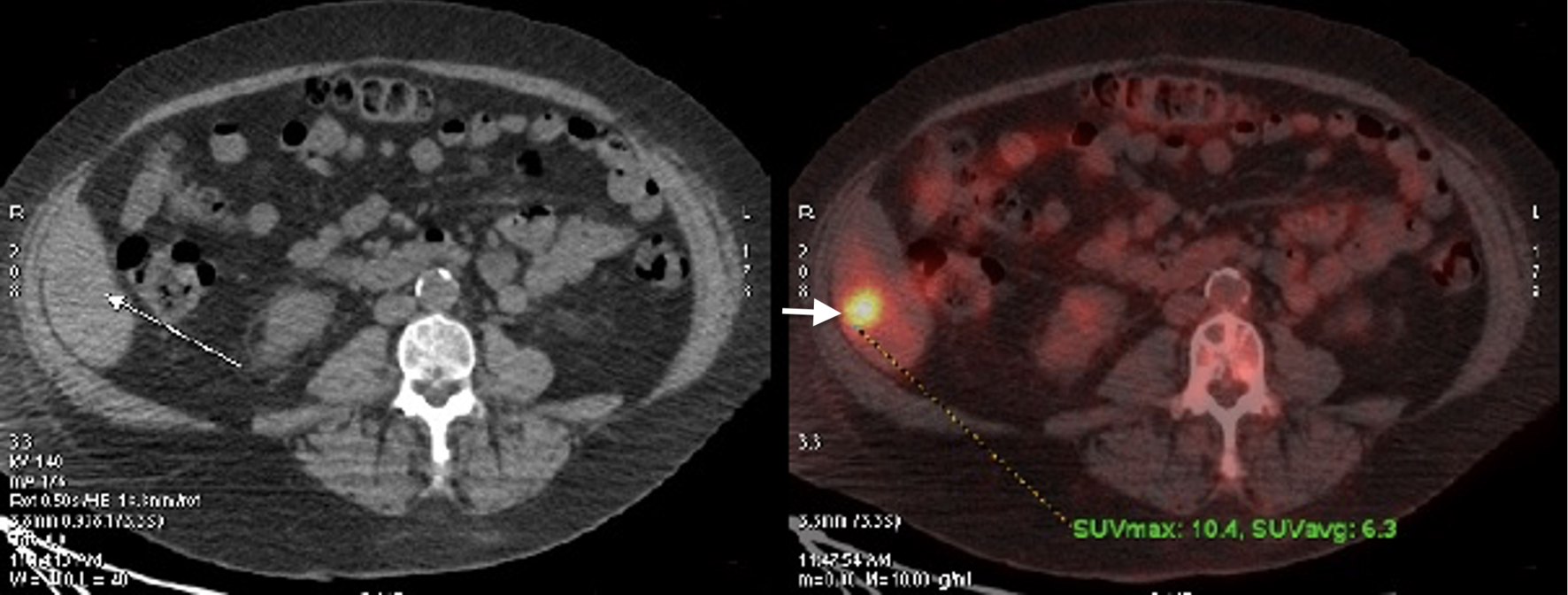 Extramedullary myeloma (EMM) is defined as the presence of malignant plasma cell tumors outside the bone marrow which may be from direct spread to the surrounding soft tissue from the bone or arising in extraosseous locations. The initial presentation of extramedullary disease is found typically on advanced imaging techniques: such as CT, MRI, or PET as is the case of our patient. MM with extramedullary, non-osseous disease typically has an incidence of 1-4% in all new presentations and up to 10% on relapse. The incidence of EMM of the bone occurs more frequently at a rate of 7-34%. Myelomatous infiltration of extraosseous tissues is more frequently found in organs rich in reticuloendothelial tissues including liver, spleen and lymph nodes [3]. The most common sites of reported extramedullary involvement of MM are soft tissue surrounding the bone, lymph nodes, liver, spleen, kidneys, lungs, skin, central nervous system, testes, breasts and gastrointestinal tract [4].