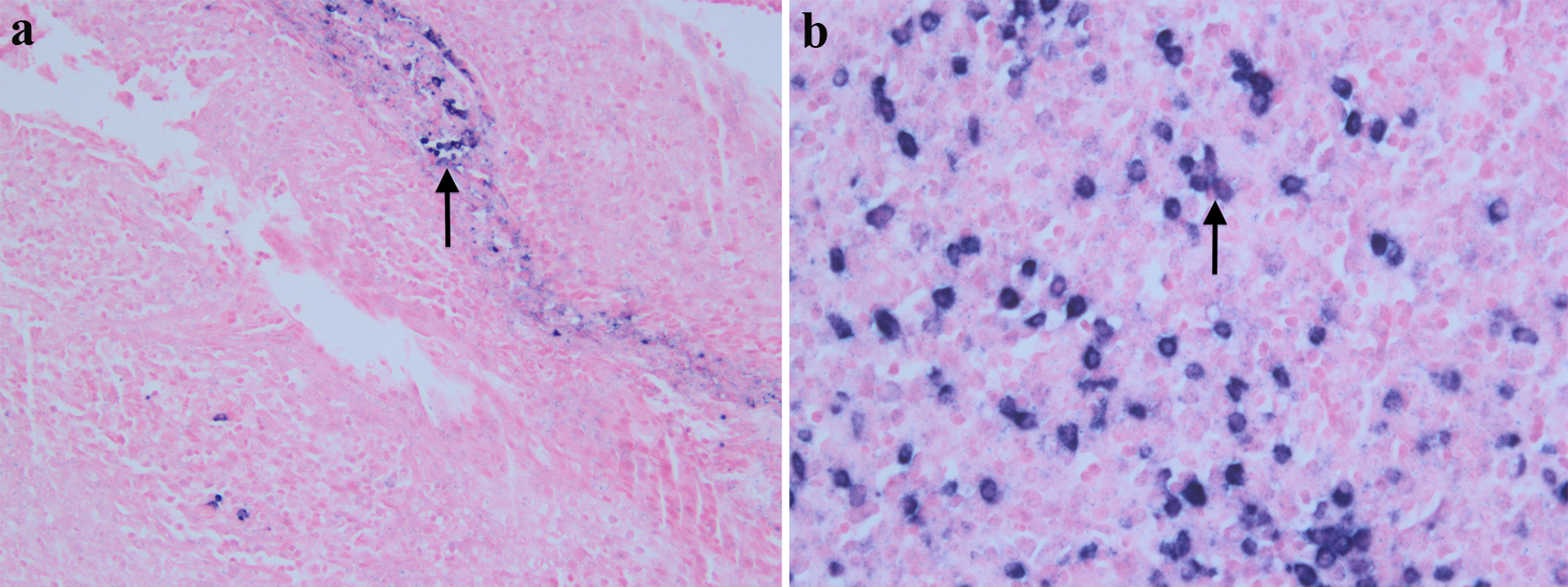 ![]() Click for large image | Figure 5. Liver biopsy with kappa in-situ hybridization at × 20 (a) and lambda in-situ hybridization at × 40 (b). The plasmacytoid cells show a kappa restriction. This immuno-histopathological presentation is consistent with kappa-restricted multiple myeloma. |