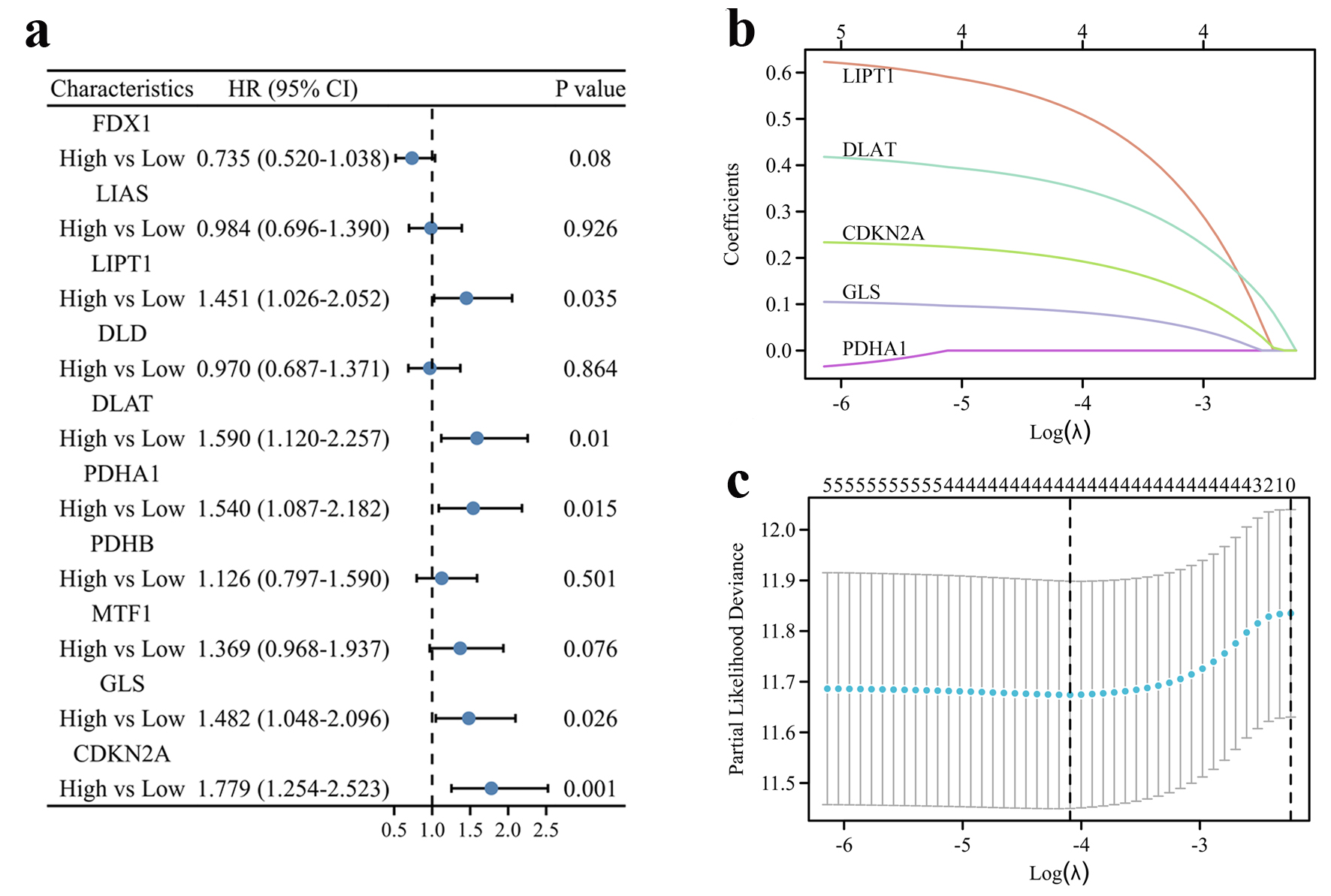 ![]() Click for large image | Figure 1. Construction of the cuproptosis-related prognostic signature in the TCGA cohort. (a) The forest plot of univariate Cox regression between OS and 10 CRGs of HCC patients in the TCGA cohort. (b) LASSO coefficient profiles of the CRGs in the TCGA cohort. (c) Cross-validation for λ parameter selection in the LASSO model. |