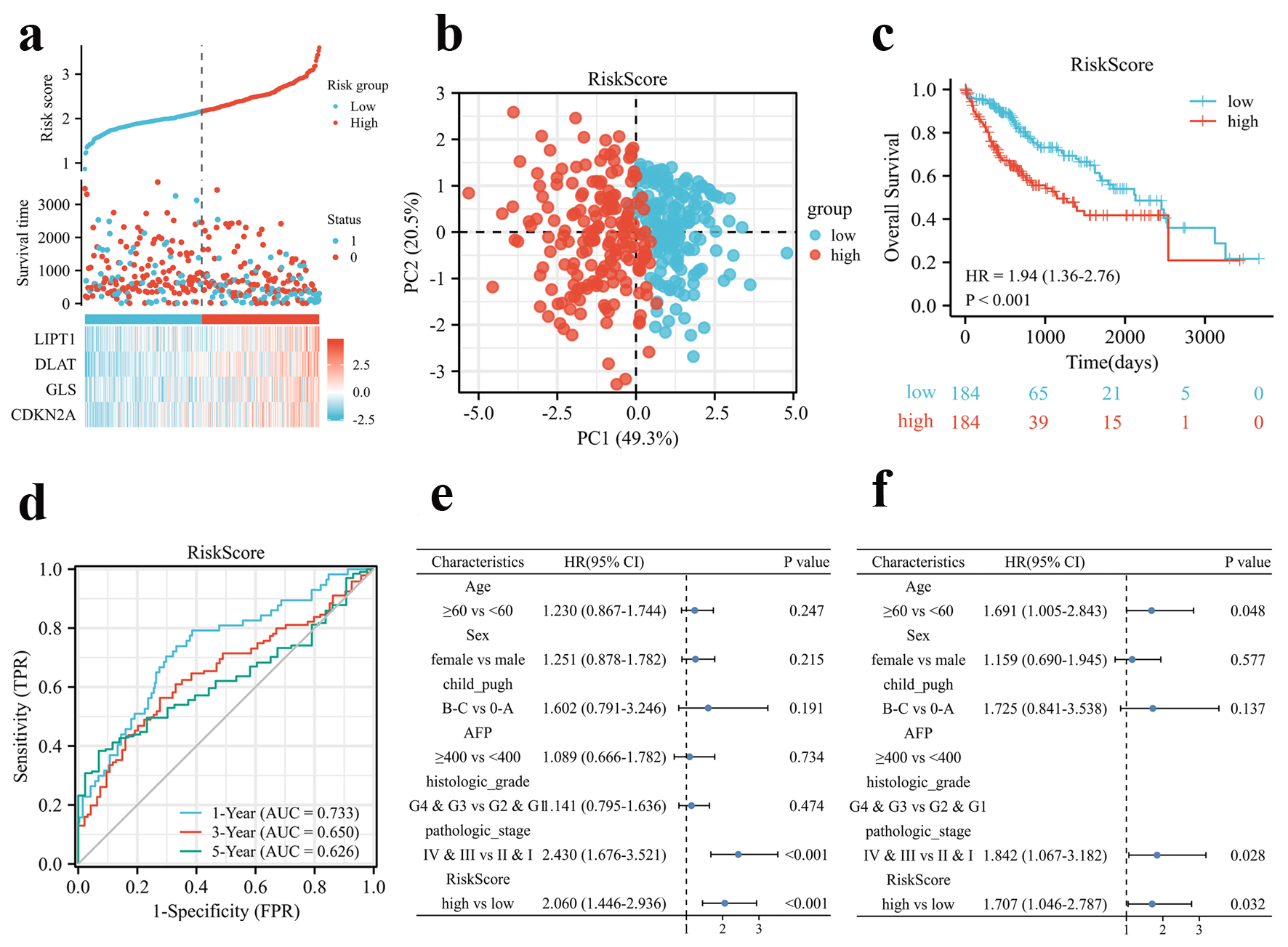 ![]() Click for large image | Figure 2. Prognosis analysis of the CRGs signature in the TCGA cohort. (a) Risk scores based on CRGs prognostic signatures (above), survival of HCC patients with high- or low-risk scores (middle), and expression of four CRGs that constitute the prognostic signature in the TCGA cohort (below). (b) PCA analysis of high- and low-risk scores in the TCGA cohort. (c) Kaplan-Meier plot of OS between high- and low-risk score groups in the TCGA cohort. (d) Time-dependent ROC curves for the prognostic performance of the CRGs signature in the TCGA cohort. (e, f) Univariate (e) and multivariate (f) Cox regression analyses regarding OS evaluated the prognostic value of the CRGs signature and other factors in the TCGA cohort. HR: hazard ratio. |