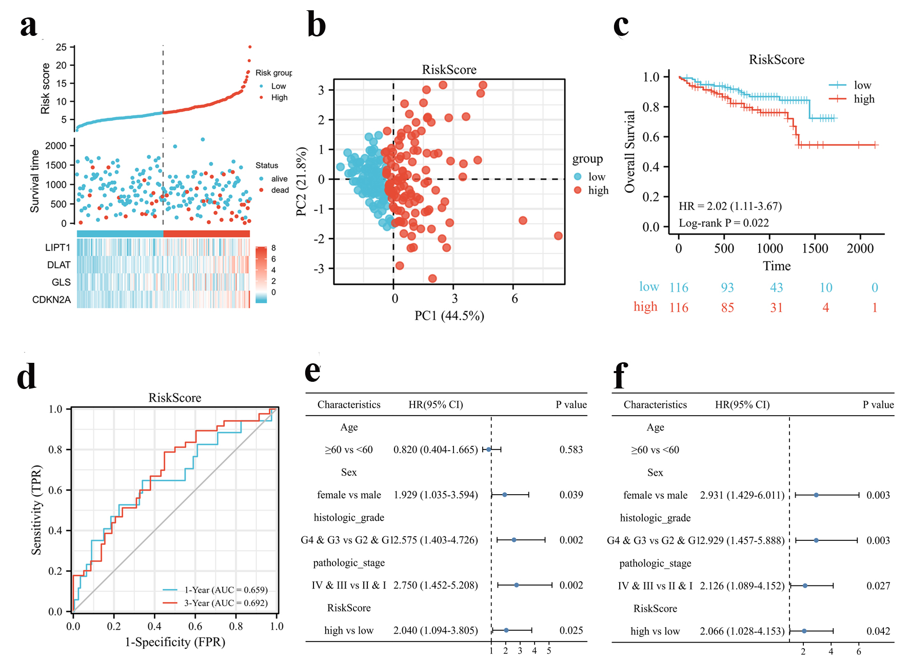 Thus, patients were stratified into high and low groups according to the four CRGs risk score (Fig. 2a), and an analysis of PCA revealed a two-way distribution of patients in different risk groups (Fig. 2b). Kaplan-Meier curve indicated that patients with high-risk score had a significantly worse OS than those with low-risk score (Fig. 2c). In the time-dependent ROC curve analysis for OS, the area under the curve (AUC) was 0.733 at 1 year, 0.650 at 3 years, and 0.626 at 5 years (Fig. 2d). Additionally, univariate and multivariate Cox regression analysis confirmed that risk score was an independent contributor for OS (Fig. 2e, f).