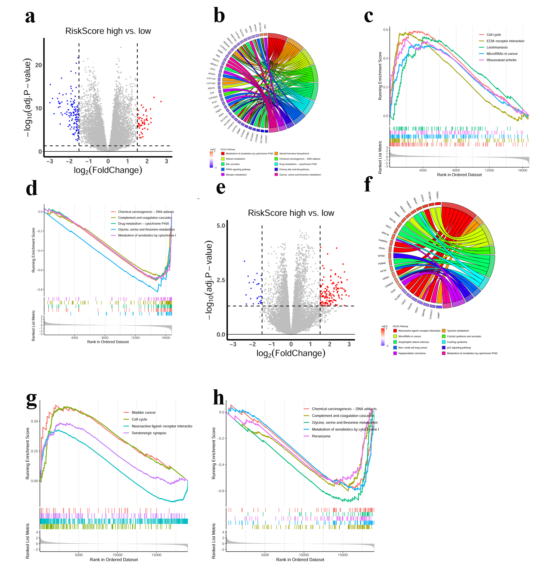 ![]() Click for large image | Figure 4. Functional annotations of the CRGs prognostic signature. (a) DEGs volcano plots between high- and low-risk score groups in the TCGA cohort. Each red dot indicates an up-regulated gene, and each blue dot indicates a down-regulated gene (Fold change > 1.5, adj. P < 0.05). (b) Circle plot showed the enriched KEGG pathways of DEGs between high- and low-risk score groups in the TCGA cohort. (c, d) GSEA analysis of DEGs in the TCGA cohort. Hallmarks that significantly enriched in the high (c) and low (d) risk score groups were shown. (e) DEGs volcano plots between high- and low-risk score groups in the ICGC cohort. Each red dot indicates an up-regulated gene, and each blue dot indicates a down-regulated gene (Fold change > 1.5, adj. P < 0.05). (f) Circle plot showed the enriched KEGG pathways for the DEGs between high- and low-risk score groups in the ICGC cohort. (g, h) GSEA analysis of DEGs in the ICGC cohort. Hallmarks that significantly enriched in the high (g) and low (h) risk score groups were shown. |
