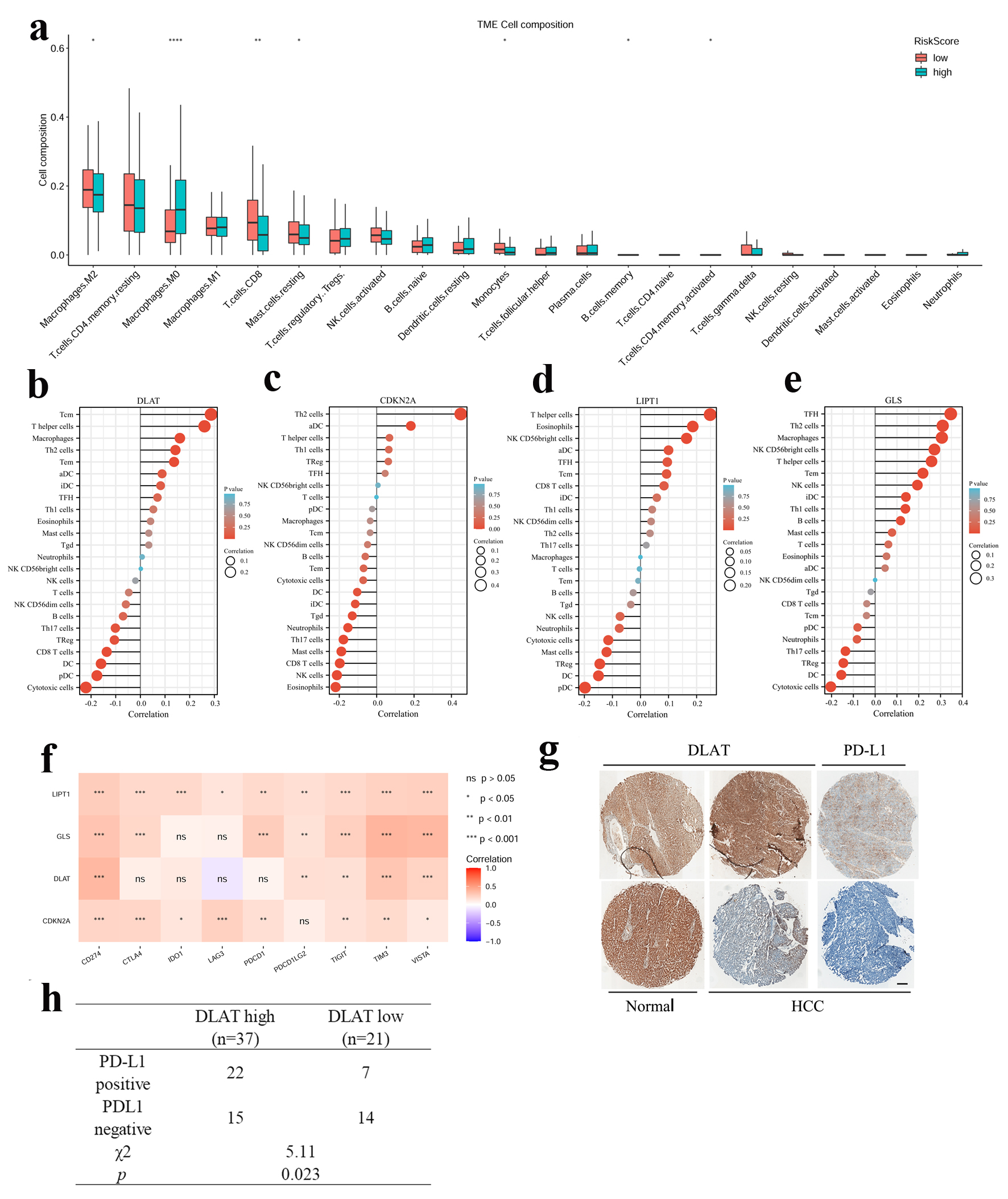 By using the “CIBERSORT” R package, we constructed 22 immune infiltrate profiles in HCC to test the relationship between our signature and immune microenvironment. The results revealed that increased M0 macrophage and decreased CD8+ T cells infiltration were associated with high-risk scores (Fig. 5a, Supplementary Figure 4A, B, www.wjon.org). Further ssGSEA analysis revealed that DLAT, CDKN2A, LIPT1 and GLS were positively correlated with several CD4+ T cell subsets, such as T helper cells, Th2 cells, and were negatively correlated with CD8+ cytotoxic cells, DC and pDC in the high-risk group (Fig. 5b-e). Based on the above results, HCC patients with high-risk scores may display an immune suppressive microenvironment. Furthermore, we found that the four CRGs were correlated with the expression of most immune checkpoint-related genes (Fig. 5f). Interestingly, DLAT had the strongest positive correlation with CD274 (PD-L1), while GLS had positive correlation with VISTA and TIM3 in the TCGA cohort (Fig. 5f). To further confirm the correlation, we assessed the expression of DLAT and PD-L1 in HCC tissues. The results of IHC staining showed that patients with higher expression of DLAT in HCC were accompanied by higher expression of PD-L1 (Fig. 5g, h, Supplementary Figure 4C, www.wjon.org).
