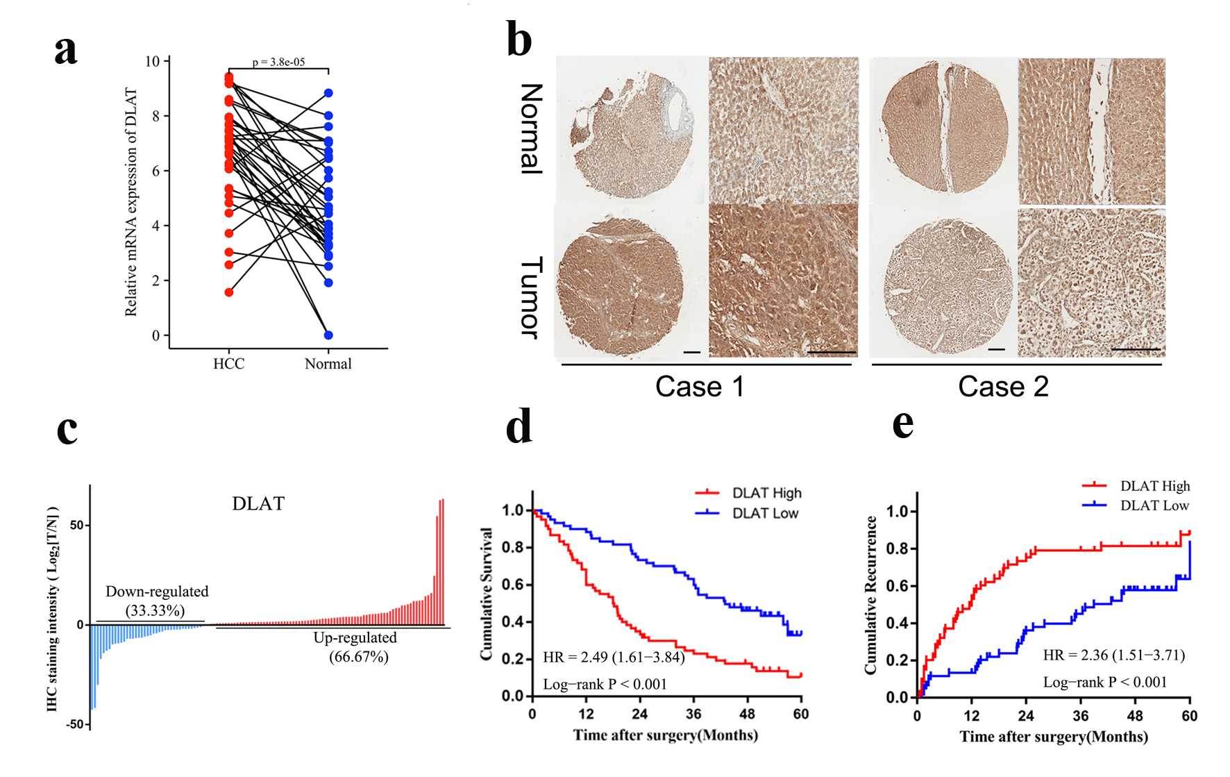 Since DLAT was highly expressed in HCCs and correlated with poor prognosis of patients in both the TCGA and ICGC cohorts (Supplementary Figures 1A, 1C, 2A, 2C, www.wjon.org), we firstly investigated the mRNA expression of DLAT in 36 paired HCC and paratumor tissues. The expression of DLAT mRNA was significantly higher in HCC tissues than that in paired paratumor tissues, as shown in Figure 6a. Moreover, immunohistochemical staining further confirmed the increased expression of DLAT in HCC samples in a large cohort comprising 120 patients (cohort 1), in which 66.67% of patients exhibited increased DLAT expression in HCC tissues compared with paired paratumor tissues (Fig. 6b, c). Subsequently, patients in cohort 1 were divided into high and low groups based on the median expression of DLAT to determine its prognostic value. As shown in Supplementary Table 1 (www.wjon.org), the expression of DLAT was correlated with several baseline characteristics including portal vein tumor thrombus (PVTT), Barcelona Clinic Liver Cancer (BCLC) stage and tumor, node, metastasis (TNM) stage. Univariate analysis showed that alpha fetoprotein (AFP), satellite, macroscopic vascular invasion (MVI), PVTT, single or multiple, TNM stage, Child-Pugh and DLAT were correlated with patient’s OS and DFS (Supplementary Tables 2 and 3, www.wjon.org). Based on multivariate Cox regression, high DLAT is independently associated with poor OS and RFS (Supplementary Tables 2 and 3, www.wjon.org). Kaplan-Meier survival analysis showed that patients with high expression of DLAT exhibited worse OS and RFS compared to patients with low expression of DLAT (Fig. 6d, e). Based on these findings, DLAT was significantly up-regulated in clinical HCC tissues and associated with poor outcome of patients.
