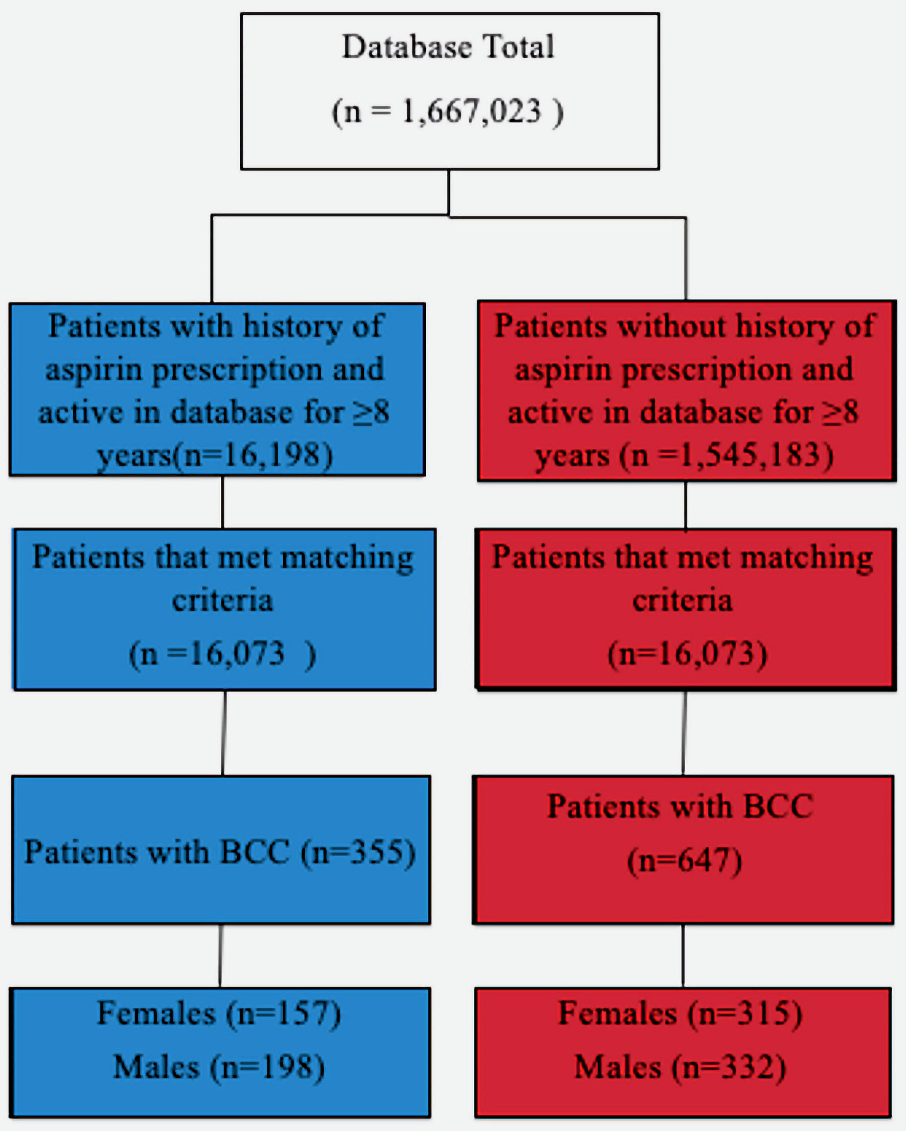 Methods: A retrospective study (2010 - 2018) was conducted using the Humana Health Insurance Database. International Classification of Disease ninth and 10th codes and National Drug Codes were used to identify BCC diagnoses and aspirin prescriptions. Patients were matched for age, sex, Charlson Comorbidity Score (CCI), and region of residence. Chi-squared, logistic regression, and odds ratio (OR) analyses were utilized to test for significance and to estimate relative risk.