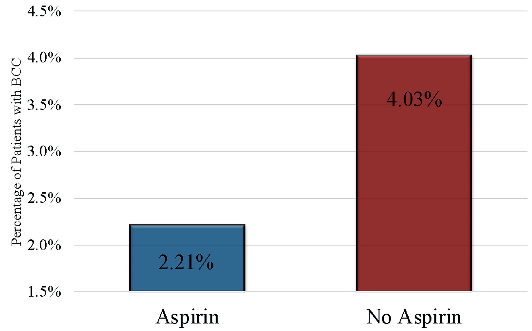 While the high incidence and cost of treatment of BCC are demanding both clinically and financially, the low cost of aspirin and its widespread use may have vital implications for its preventative role in this disease. This study concluded that aspirin use significantly decreased the risk of BCC.