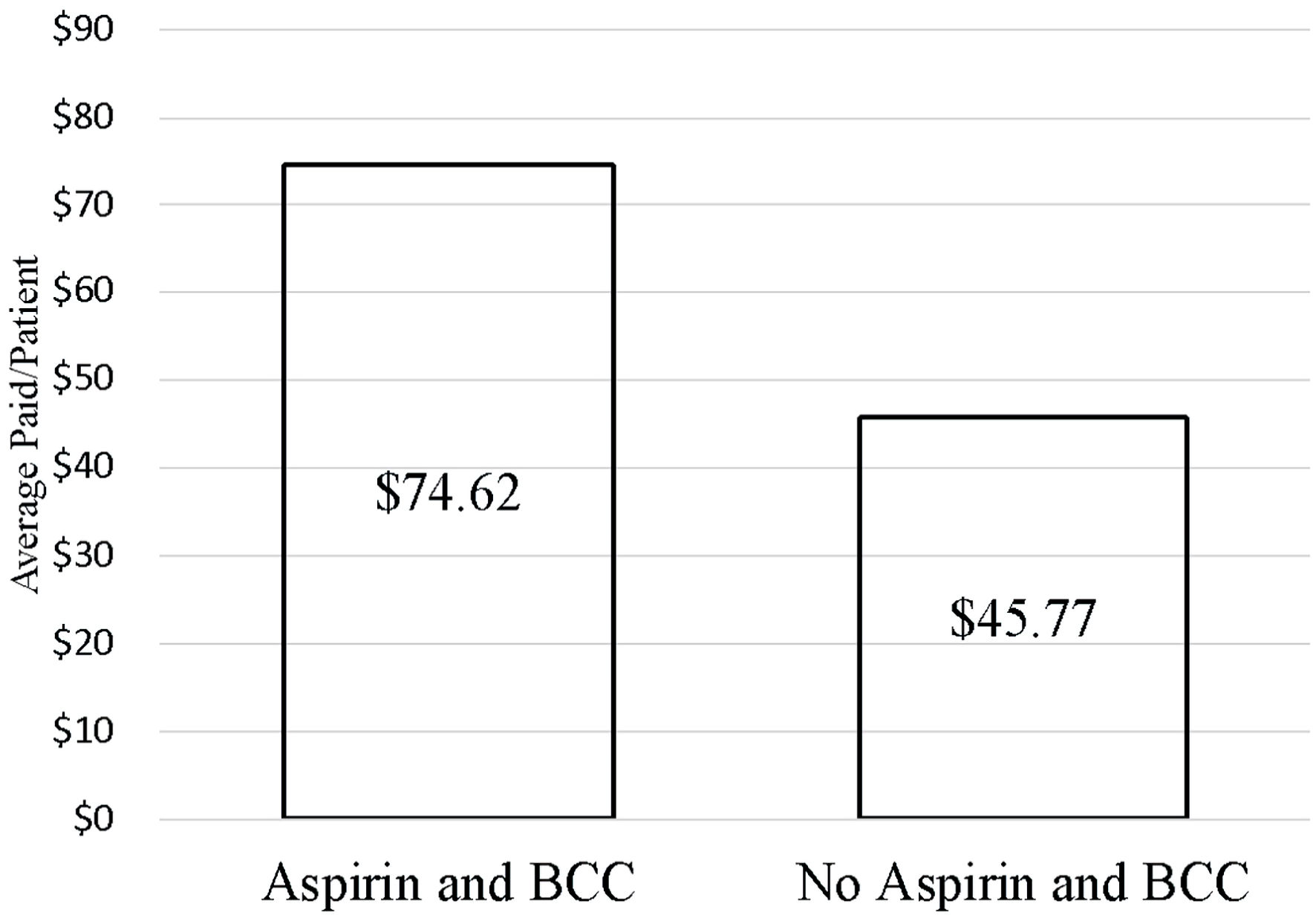 ![]() Click for large image | Figure 3. Average paid per patient for BCC treatment compared between aspirin use and nonuse (P = 0.0087). BCC: basal cell carcinoma. |