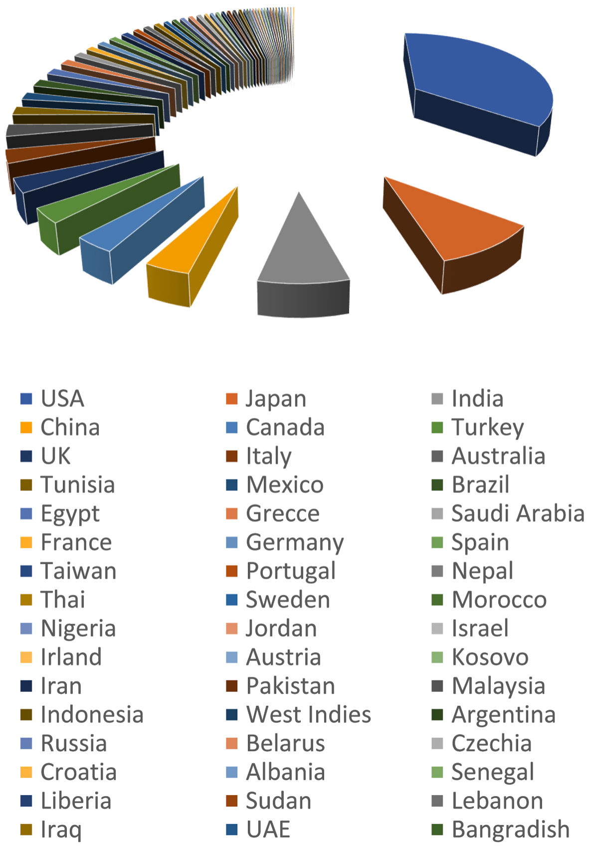 ![]() Click for large image | Figure 2. Numbers of articles published in the World Journal of Oncology (2010 - 2022) from each country: USA 178, Japan 53, India 43, China 22, Canada 20, Turkey 18, UK 17, Italy 16, Australia 14, Tunisia 10, Mexico 9, Brazil 9, Egypt 8, Greece 7, Saudi Arabia 6, France 5, Germany 5, Spain 5, Taiwan 5, Portugal 4, Nepal 4, Thailand 4, Sweden 3, Morocco 3, Nigeria 3, Jordan 3, Israel 3, Ireland 2, Austria 2, Kosovo 2, Iran 2, Pakistan 2, Malaysia 2, Indonesia 2, West Indies 1, Argentina 1, Russia 1, Belarus 1, Czechia 1, Croatia 1, Albania 1, Senegal 1, Liberia 1, Sudan 1, Lebanon 1, Iraq 1, UAE 1, Bangladesh 1, Korea 1, Vietnam 1, Singapore 1, Philippines 1, respectively. UAE: United Arab Emirates. |