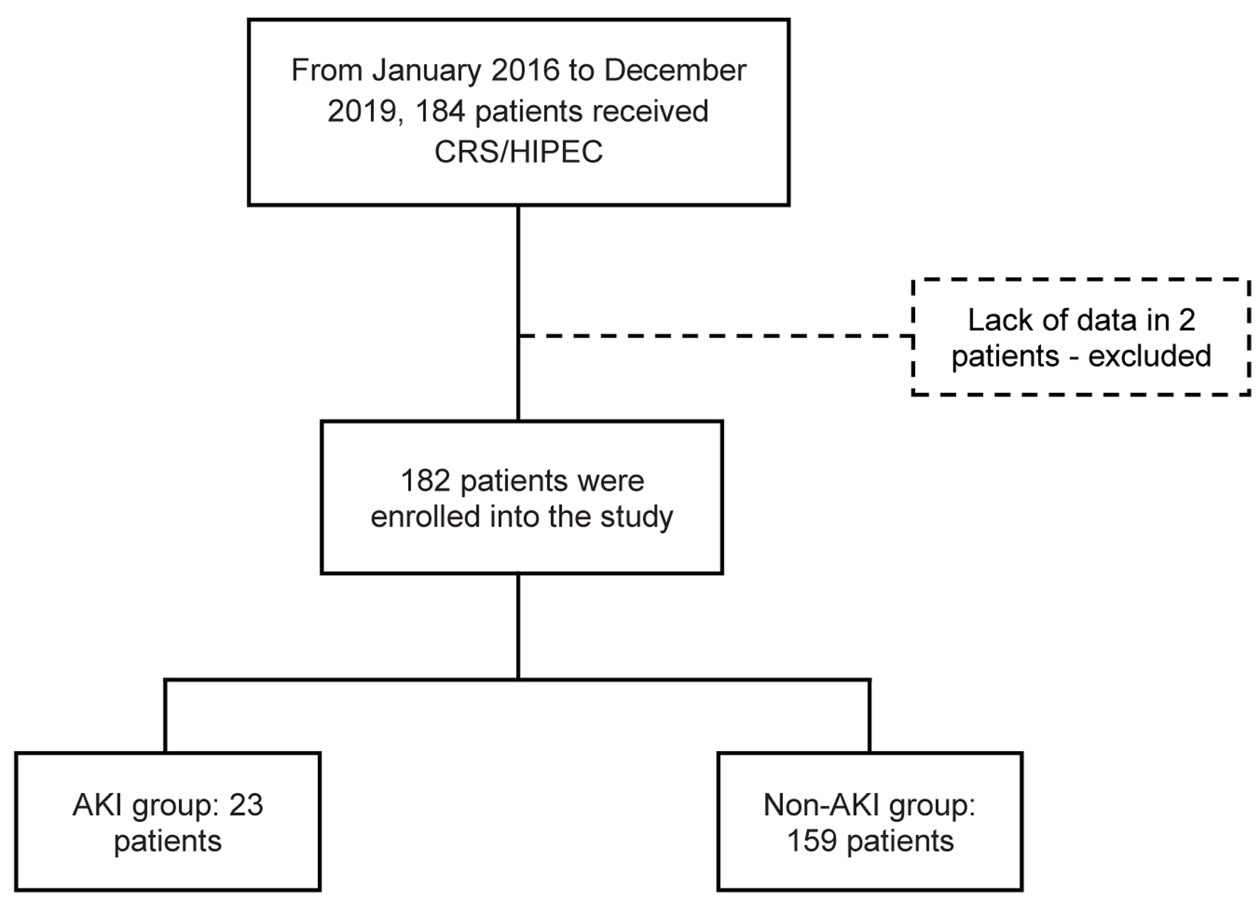 The 184 patients analyzed received CRS/HIPEC procedures in our unit during the period specified above. The patient enrollment flowchart is shown in Figure 1. From a total of 184 patients, 182 patients were included in the study (in two patients, there were no data on renal function during hospitalization).