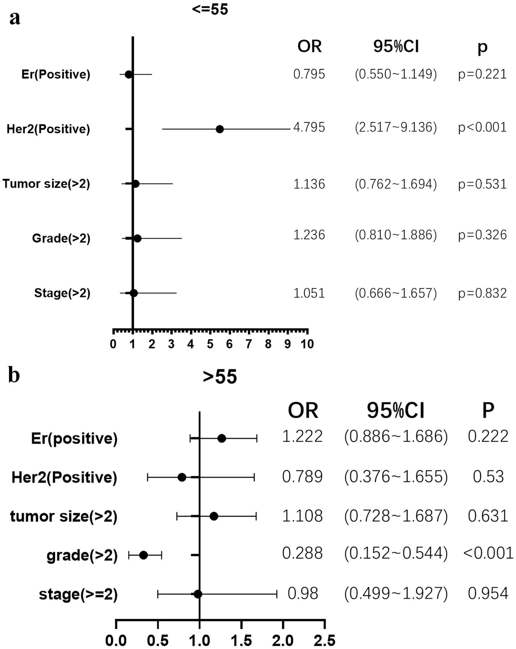 The patient’s age group less than 55 years with high BMI are more likely to be HER2 positive (OR = 4.795, 95% CI = 2.517 - 9.136, P < 0.001) when compared to the breast cancer patients with normal weight (Fig. 1a). Furthermore, breast cancer patients older than 55 years were accompanied by high BMI, and they are more likely to have a tumor grade greater than 2 (OR = 0.288, 95% CI = 0.152 - 0.544, P < 0.001) (Fig. 1b) when compared to the breast cancer patients with normal weight (Table 4).