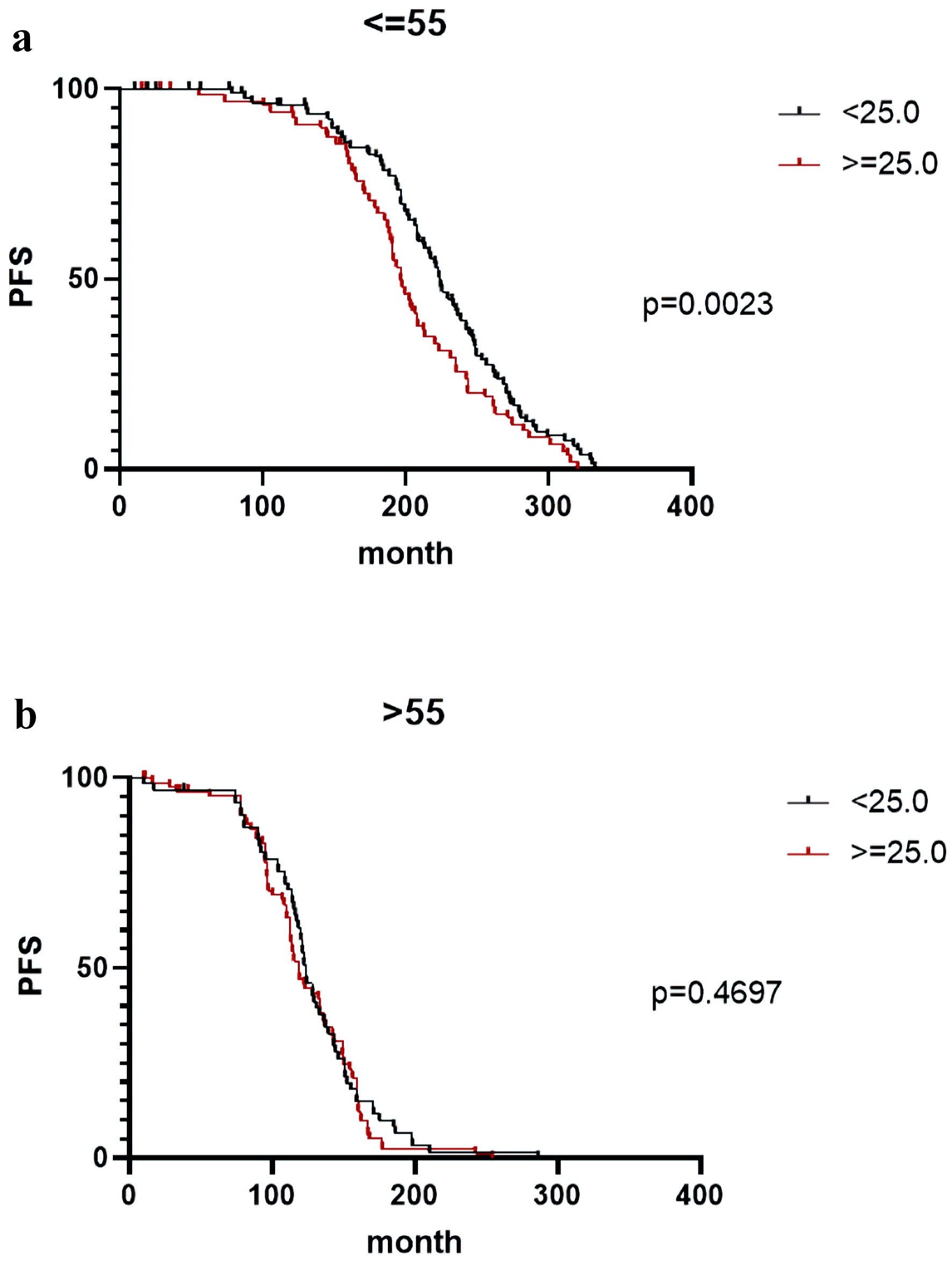 In this study, both recurrence and distant recurrence were considered as “disease progression”. High BMI was associated with worse progression-free survival (PFS) in younger, but not in older patients. Figure 2a depicts that the breast cancer patients with high BMI are more likely to have “recurrence and distant recurrence” in a relatively short period (P = 0.0023), when compared to normal BMI patients mainly among breast cancer patients (< 55 years). However, this difference was not observed in breast cancer patients of age group older than 55 years (P = 0.4597) (Fig. 2b). Additional information related to results between breast cancer patients of different ages and people without breast cancer can be found here (Supplementary Material 1, www.wjon.org), as well the BMI classification of breast cancer patients at different ages (Supplementary Material 2, www.wjon.org). Furthermore, PFS periods of different ages by BMI categories are provided (Supplementary Material 3, www.wjon.org). Results between breast cancer patients of different ages and people without breast cancer are given here (Supplementary Material 4, www.wjon.org), whereas the results pertinent to BMI classification of breast cancer patients at different ages are provided (Supplementary Material 5, www.wjon.org). We also provided PFS periods of different ages by BMI categories (Supplementary Material 6, www.wjon.org).