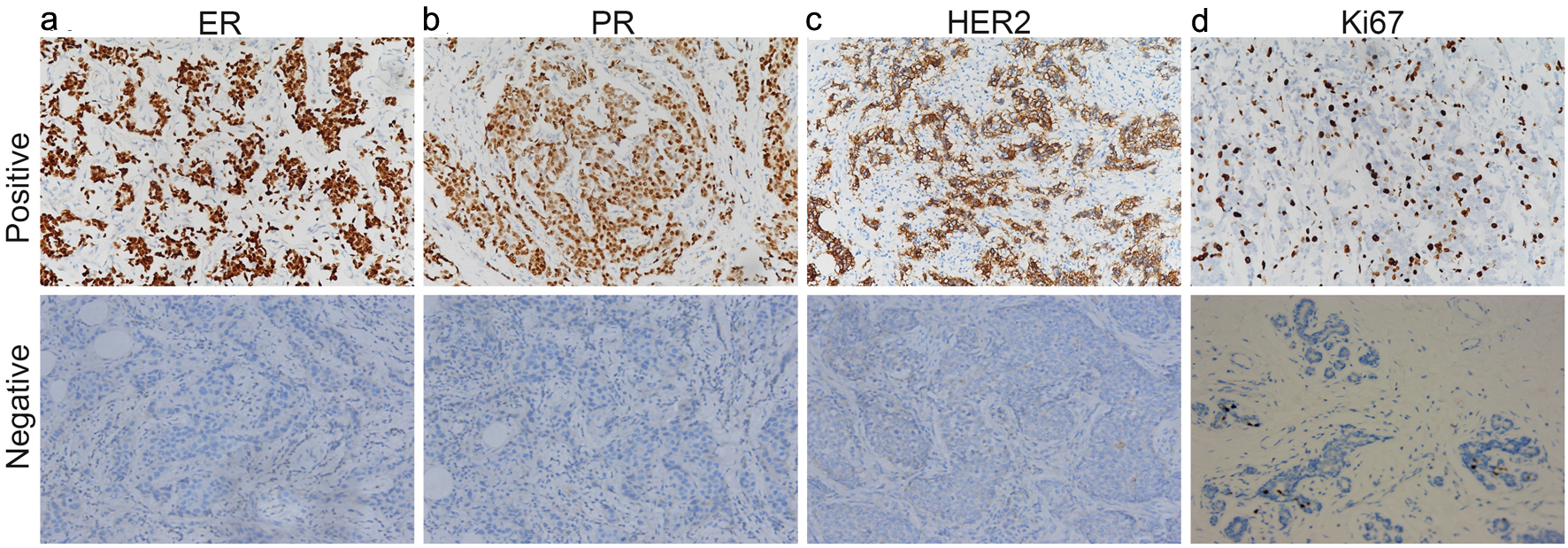 The guidelines of China were applied to extract the surgical tumors, including the histological grade, PR status, HER2 status and the Ki67 index. ER and PR were graded 0 if there was no expression, 1+ if the expression was 0-10%, 2+ if the expression was 10-50%, and 3+ if the expression was ≥ 50%. Grades 2+ and 3+ were considered positive and 1+ or 0 was considered negative [27]. Similar standards were also used for HER2. HER2 positivity was defined as IHC score of 3+ or fluorescence in situ hybridization (FISH) 2+ with amplification [28]. The cutoff value of Ki67 expression was 20%. The expression ratio > 20% was regarded as Ki67 high expression, and the expression ratio ≤ 20% was regarded as Ki67 low expression [29, 30]. The typical pictures are shown in Figure 1.