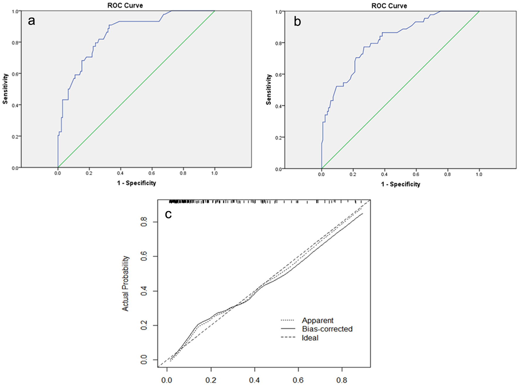 ![]() Click for large image | Figure 3. (a) The ROC curve of the modeling group. The AUC is 0.855 (95% CI: 0.793 - 0.917). (b) The ROC curve of the validation group. The AUC is 0.818 (95% CI: 0.747 - 0.888). (c) Calibration plot of the nomogram for predicting the probability of breast cancer metastasis. ROC: receiver-operating characteristic; AUC: area under the ROC curve; CI: confidence interval. |