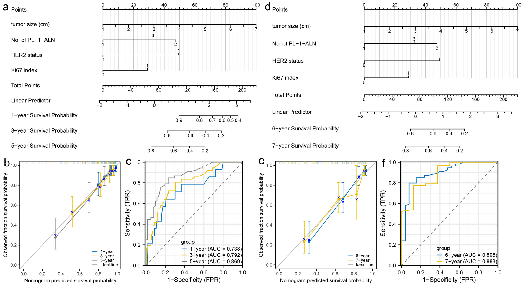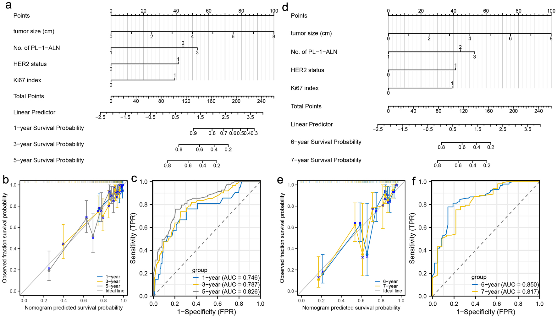 For the pre-menopausal patients, a nomogram was constructed to predict the 1-, 3-, and 5-year metastasis probability of patients using tumor size, No. of PL-1-ALN, HER2 status and Ki67 index for the early stage (Fig. 5a). Calibration curves were created to predict the metastasis probability for the 1-, 3-, and 5-year periods with reasonable accuracy (Fig. 5b). The predictions made by the nomogram were close to the actual outcomes. Subsequently, the ROC curves and AUC values were calculated (Fig. 5c). The ROC curves are significantly above the diagonal dashed lines, with AUC values above 0.7. The above results showed that this nomogram had significant high diagnosis ability for the early metastasis probability of patients. For the late stage, a nomogram was constructed to predict the 6- and 7-year metastasis probability of patients using tumor size, No. of PL-1-ALN, HER2 status and Ki67 index (Fig. 5d). Calibration curves were created to predict the metastasis probability for the 6- and 7-year periods with reasonable accuracy (Fig. 5e). The predictions made by the nomogram were close to the actual outcomes. Subsequently, the ROC curves and AUC values were calculated (Fig. 5f). The ROC curves are significantly above the diagonal dashed lines, with AUC values even above 0.8. The above results showed that this nomogram had significant high diagnosis ability for the late metastasis probability of patients.