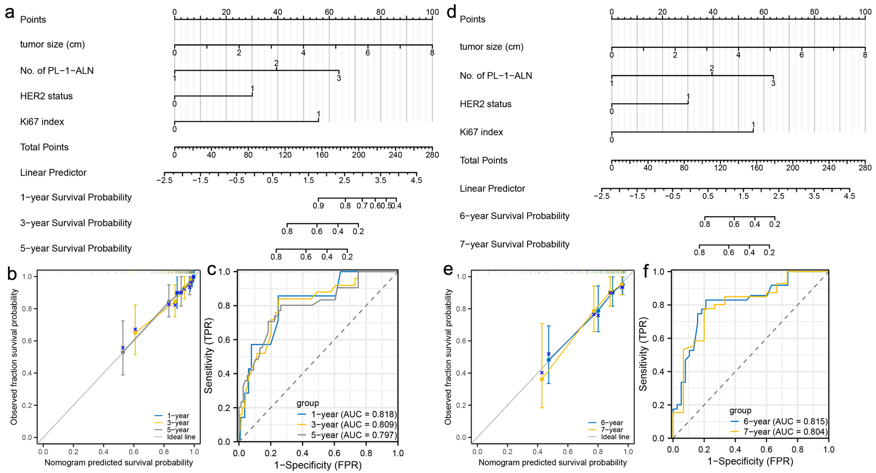 For the post-menopausal patients, a nomogram was constructed to predict the 1-, 3-, and 5-year metastasis probability of patients using tumor size, No. of PL-1-ALN, HER2 status and Ki67 index for the early stage (Fig. 6a). Calibration curves were created to predict the metastasis probability for the 1-, 3-, and 5-year periods with reasonable accuracy (Fig. 6b). The predictions made by the nomogram were close to the actual outcomes. Subsequently, the ROC curves and AUC values were calculated (Fig. 6c). The ROC curves are significantly above the diagonal dashed lines, with AUC values above 0.7. The above results showed that this nomogram had significant high diagnosis ability for the early metastasis probability of patients. For the late stage, a nomogram was constructed to predict the 6- and 7-year metastasis probability of patients using tumor size, No. of PL-1-ALN, HER2 status and Ki67 index (Fig. 6d). Calibration curves were created to predict the metastasis probability for the 6- and 7-year periods with reasonable accuracy (Fig. 6e). The predictions made by the nomogram were close to the actual outcomes. Subsequently, the ROC curves and AUC values were calculated (Fig. 6f). The ROC curves are significantly above the diagonal dashed lines, with AUC values even above 0.8. The above results showed that this nomogram had significant high diagnosis ability for the late metastasis probability of patients.