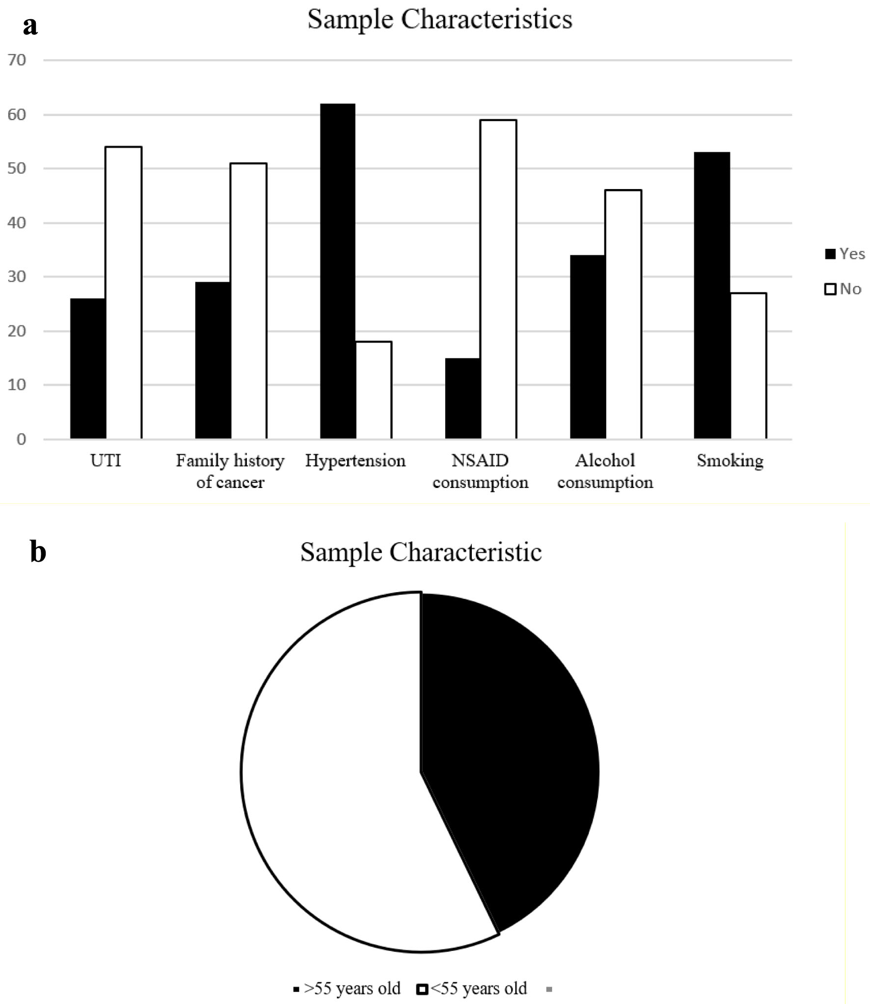 ![]() Click for large image | Figure 1. Baseline characteristics of nephrolithiasis patients. (a) Comorbidities: UTI (yes: 26 (32.5%), no: 54 (67.5%)), family history of cancer (yes: 29 (36.3%), no: 51 (63.7%)), hypertension (yes: 62 (77.5%), no: 18 (22.5%)), NSAID consumption (yes: 15 (18.7%), no: 59 (81.3%)), alcohol consumption (yes: 34 (42.5%), no: 46 (57.5%)), and smoking (yes: 53 (66.3%), no: 27 (33.7%)). (b) Age (> 55 years old: 36 (40%), < 55 years old: 48 (60%); mean ± SD: 48.77 ± 7.23). NSAID: nonsteroidal anti-inflammatory drug; SD: standard deviation; UTI: urinary tract infection. |