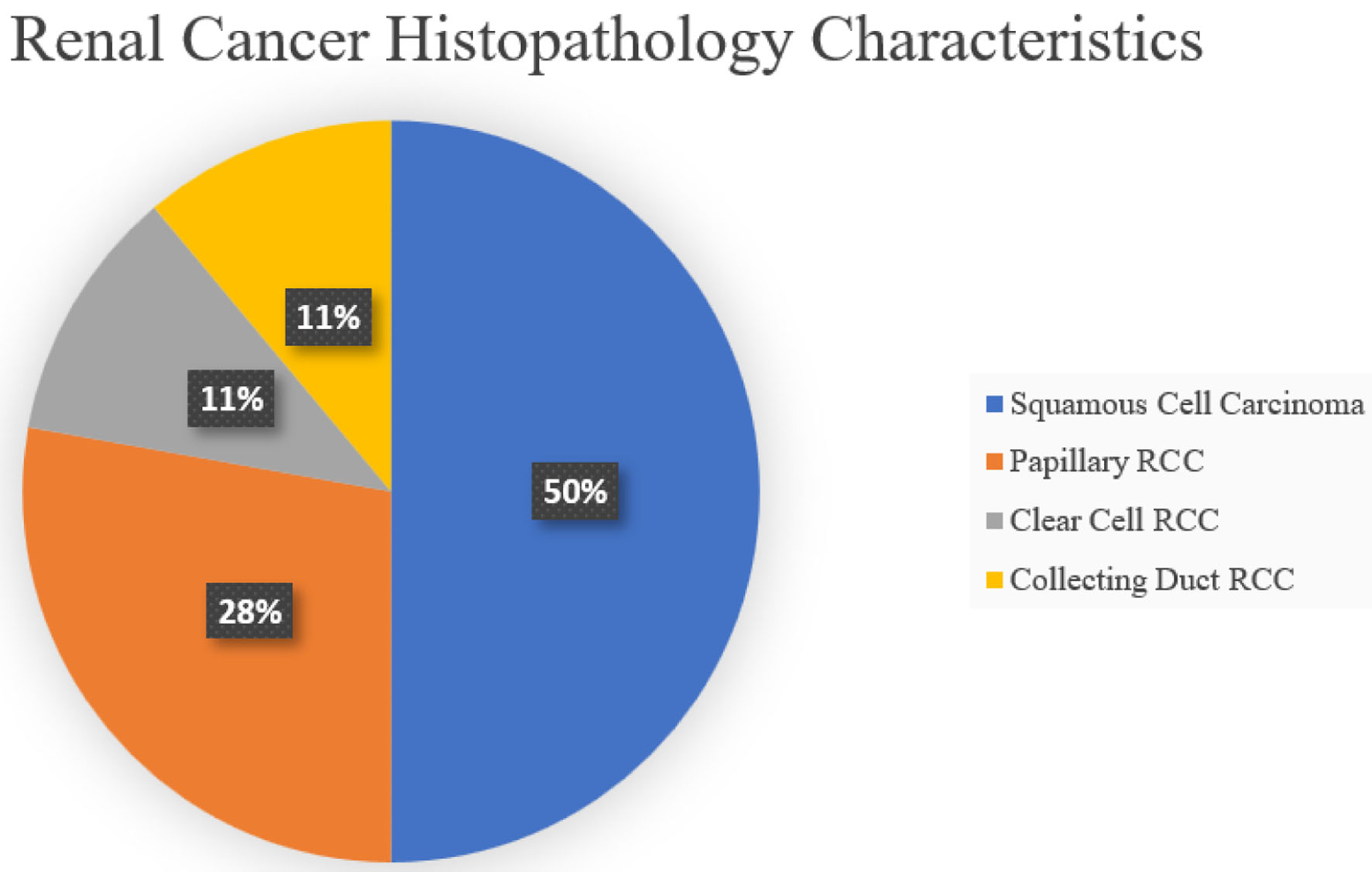 ![]() Click for large image | Figure 2. Renal cancer histopathology characteristics which consist of squamous cell carcinoma (9 (50%)), papillary RCC (5 (27.8%)), clear cell RCC (2 (11.1%)), and collecting duct RCC (2 (11.1%)). RCC: renal cell carcinoma. |