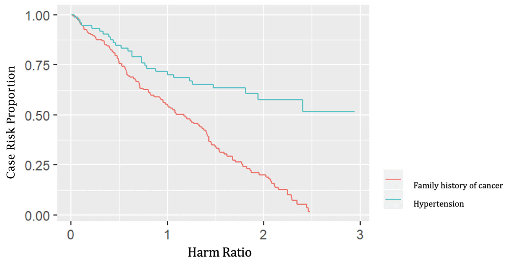 ![]() Click for large image | Figure 3. The result of Cox’s proportional hazard regression model when comparing the cancer family history and hypertension with the possibility of causing renal cancer. |