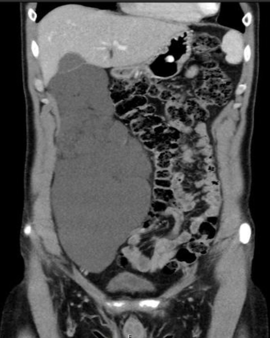 ![]() Click for large image | Figure 1. An abdomino-pelvic CT scan (coronal plane) showing a large septated, multiloculated right retroperitoneal cystic mass, displacing the right colon medially. CT: computed tomography. |