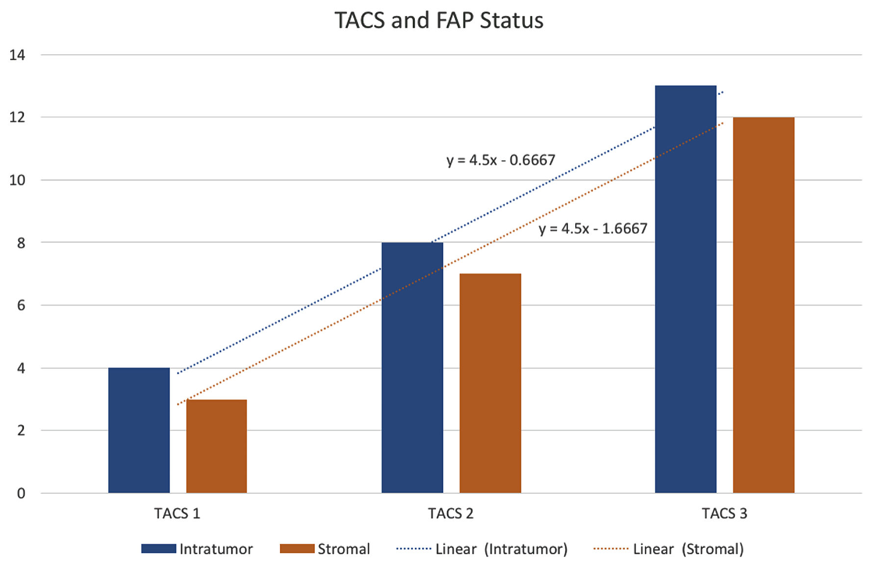 ![]() Click for large image | Figure 1. FAP status assessed according to TACS grading. TACS: tumor-associated collagen signature; FAP: fibroblast activation protein. |