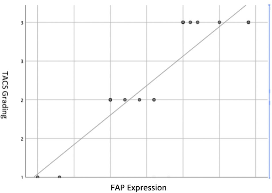 Results: FAP manifestation correlated positively with TACS degree (Spearman rho test r = 0.51; P = 0.0001). FAP was positive in 25 (96%) of all intratumor samples and positive in 22 (84%) of all stromal samples.
