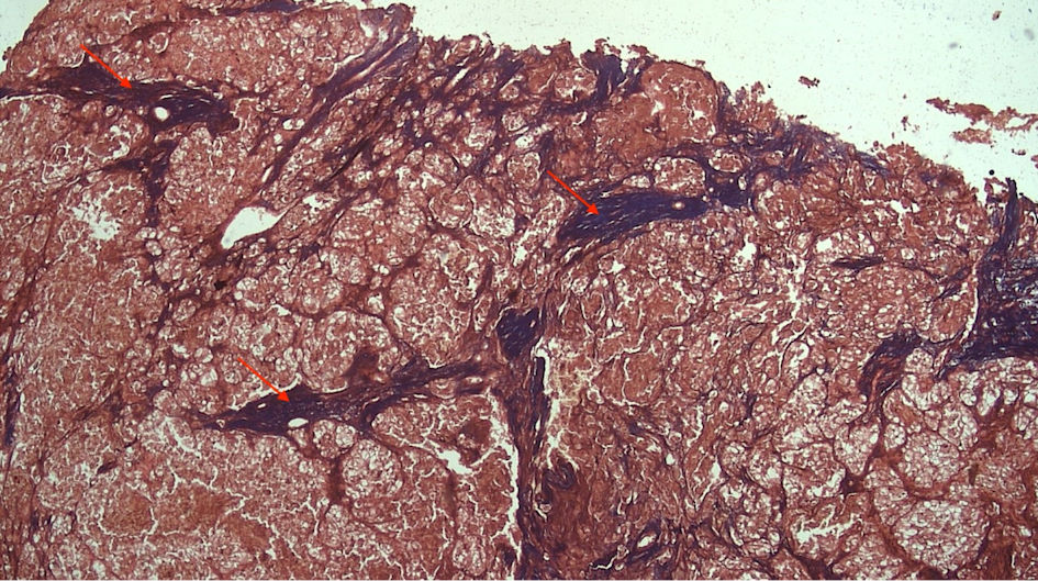 Subjects involved in this research were similar in age. However, most of the subjects involved in this study were male (Table 1). FAP expression correlated positively with TACS despite the tumor being in the stromal or intratumoral (y = 4.5x - 0.6667 in intratumoral tumors, and y = 4.5x - 1.6667 in stromal tumors, as seen in Figure 1). According to the Spearman rho test results, there was a positive correlation between the TACS degree to intratumor samples (96%) and stromal samples (84%), respectively accounted for 25 and 22 patients (y = 0.5x + 0.8; P = 0.0001) (Fig. 2). Histopathological images of TAC-3 collagen deposits (Fig. 3), and positive intratumoral and stromal FAP are illustrated below (Figs. 4, 5).