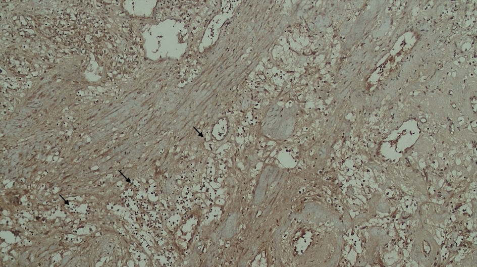 The FAP expression evaluation was carried out by using tissue microarrays, and tumor tissue at the front of invasion into renal parenchyma was selected in each case. The FAP antibody was evaluated in the stromal fibroblast adjacent to the neoplastic nest. Tris-ethylenedinitrilotetraacetic acid (EDTA) was used for antigen retrieval to be analyzed as test slides. Negative controls used were microscopic samples unexposed to the primary antibody and incubated in the phosphate buffered saline (PBS) to be processed under the same conditions as the test slides. The analysis was performed using Olympus CX 22 instrument.