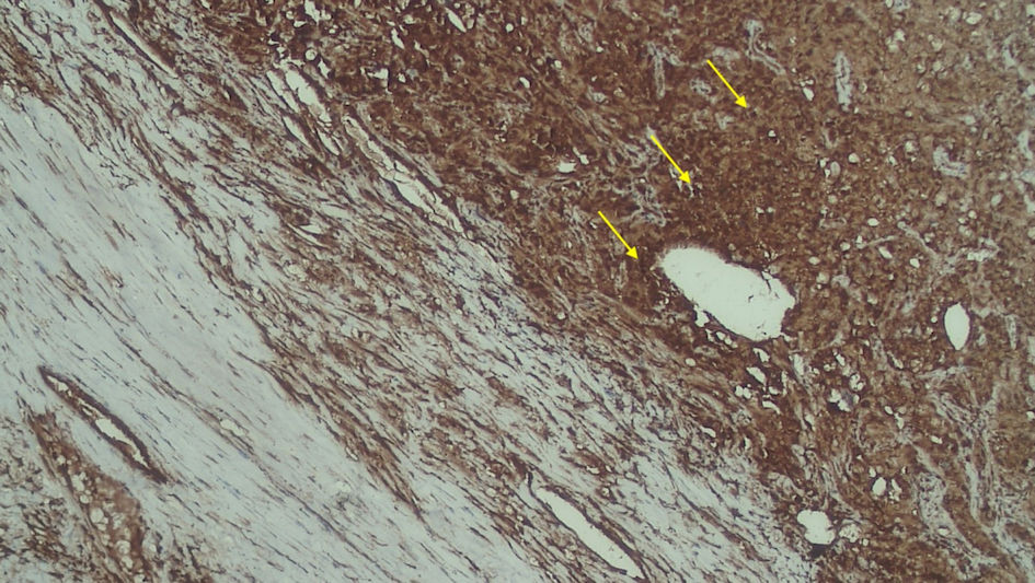 ![]() Click for large image | Figure 5. Positive FAP expression in the stromal (yellow arrow). FAP: fibroblast activation protein. |