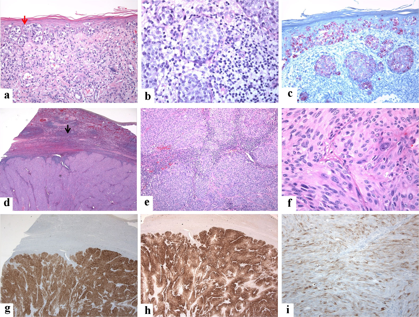 ![]() Click for large image | Figure 1. A 72-year-old male patient presented with vague mild pain in the left hypochondrium. He had a past medical history of malignant melanoma of the scalp that was treated with a wide local excision 25 years back (the tumor was grossly 1.0 cm in greatest dimension, microscopically Clark’s level IV, number of mitoses 1.0/mm2, without ulcerations or signs of regression, and all margins were negative). Clinical examination revealed no organomegaly or masses or skin lesions (apart from an old residual scar from the previous excision of melanoma on the scalp). Laboratory tests were unremarkable except for high lactate dehydrogenase (LDH) levels. Radiological investigations (ultrasound and magnetic resonance imaging (MRI)) revealed a solitary 4 × 3 × 3 cm solid lesion in the spleen suggestive of a neoplastic process. No other lesions are seen. A splenectomy was done, and postoperative recovery was uneventful. Grossly, the spleen weighed 185 g and measured 11 × 8 × 5 cm. Its cut section showed a well-defined subcapsular solid mass of 4 × 3 × 3 cm with a tan-white cut section and firm consistency. The masse was bulging into, but not breaching, the splenic capsule. The surrounding’s non-neoplastic splenic tissue was unremarkable. A single small lymph node (0.5 cm) with a pink cut section and soft consistency was identified in the helium. No evidence exists of BRAF-V600 (v-RAF murine sarcoma viral oncogene homolog B1) E/K mutation by amplification refractory mutation system (ARMS) analysis. The lymph node showed reactive changes. Investigations did not reveal any other site of metastasis. The patient has completed 1-year of follow-up without signs of residual or recurrent disease. The clinicopathological findings agree with the previous reports [13-16]. The immunohistological features of the patient are shown below. (a, b) From a cutaneous malignant melanoma of the scalp, malignant cells with pagetoid spread into the epidermis (red arrow) are shown. The tumor cells are arranged in a nesting pattern in the dermis. They have round nuclei and vacuolated and pink cytoplasm. Dermal host response in lymphocytic infiltrate is seen (hematoxylin and eosin-stained section, magnification (a) × 10, (b) × 20). (c): The tumor cells show patchy reactivity for human melanoma black-45 (HMB45) (magnification: × 20). (d, e) From the spleen, it is shown the replacement of the splenic parenchyma by malignant neoplasm and residual lymphoid cells at the periphery (black arrow) (hematoxylin and eosin-stained section, magnification: (d) × 4, (e) × 10). (f) The high-power view shows round, short spindly, and ovoid cells arranged in vague solid and fascicular patterns, the tumor cells with pink cytoplasm, and eosinophilic cytoplasm (hematoxylin and eosin-stained section, magnification: × 40). (g, h, i) The melanocytic markers highlight the tumor cells ((g): S100, (h): Melan A, and (i): HMB45) (magnifications: (g) × 4, (h) × 4, and (i) × 20). The tumor cells were positive for S100, Melan A, and HMB45. Negative stains included CD45 (leukocyte common antigen (LCA), CD10, CD30, P63, pancytokeratin (AE1/AE3), epithelial membrane antigen (EMA), cytokeratin 20 (CK20), cytokeratin7 (CK7), smooth muscle actin (SMA), synaptophysin, and desmin. |