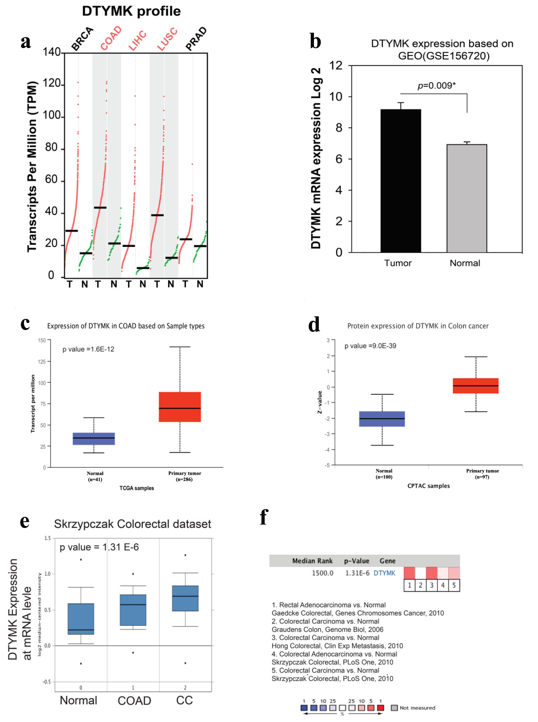 We compared the levels of DTYMK expression in normal and malignant tissues in COAD using GEPIA based on profile gene analysis. DTYMK gene was overexpressed in tumor tissues more than normal tissues in breast cancer (BRCA) (tumor (T) = 1,085/normal (N) = 112), COAD (T = 275/N = 41), liver hepatocellular carcinoma (LIHC) (T = 369/N = 50)), lung squamous cell carcinoma (LUSC) (T = 483/N = 59), and prostate adenocarcinoma (PRAD) (T = 495/N = 52). Notably, the expression of DTYMK was higher in COAD in comparison to the other types of cancers, which has an average around 45 transcripts per million TPM (Fig. 1a). We next obtained an RNA seq file based on transcriptome analysis to verify our findings. DTYMK levels in tumors were substantially greater than in normal tissues (P = 0.009) (Fig. 1b). In addition, as shown, we used the UALCAN website to assess the mRNA and protein levels of DTYMK in large study samples (Fig. 1c, d) with P-value of 1.6 ×10-12 and 9.0 × 10-39, respectively. Primary tumor tissues had higher quantities of mRNA and protein than normal tissues. We also looked at the degree of DTYMK expression in these datasets using different COAD cohort studies from the Oncomine database: rectal adenocarcinoma vs. normal, Gaedcke colorectal/colorectal carcinoma vs. normal, Graudens/colorectal carcinoma vs. normal, Hong colorectal/colorectal adenocarcinoma vs. normal, Skrzypczak colorectal/colorectal carcinoma vs. normal, Skrzypczak colorecta. DTYMK RNA expression was high in majority of the study cohorts, as seen in Figure 1e, f. Overall, tumor tissue showed a higher level of DTYMK than normal tissue, according to these data.