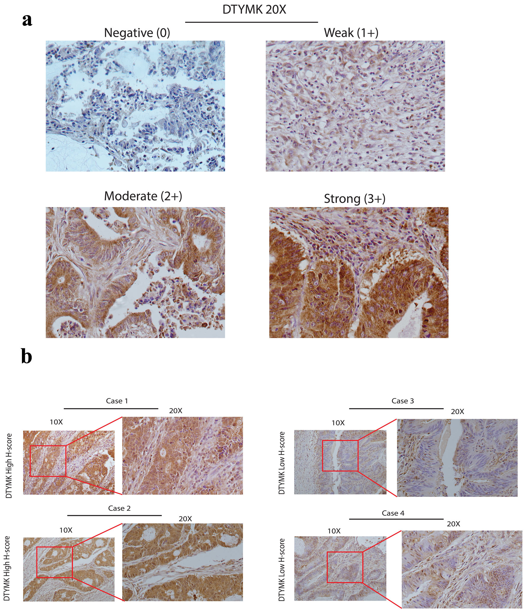 The COAD cases were evaluated according to expression of DTYMK (negative 0, weak 1+, moderate 2+ and strong 3+) (Fig. 2a). The percentage of positive and the intensity of DTYMK staining were used to determine the H-score (Table 2). Patients were categorized into two groups depending on their H-score, with the mean H-score being 9.6 out of 12. A representative image in Figure 2b shows the high H-score versus low H-score cases, which indicated the cytoplasmic expression for DTYMK.
