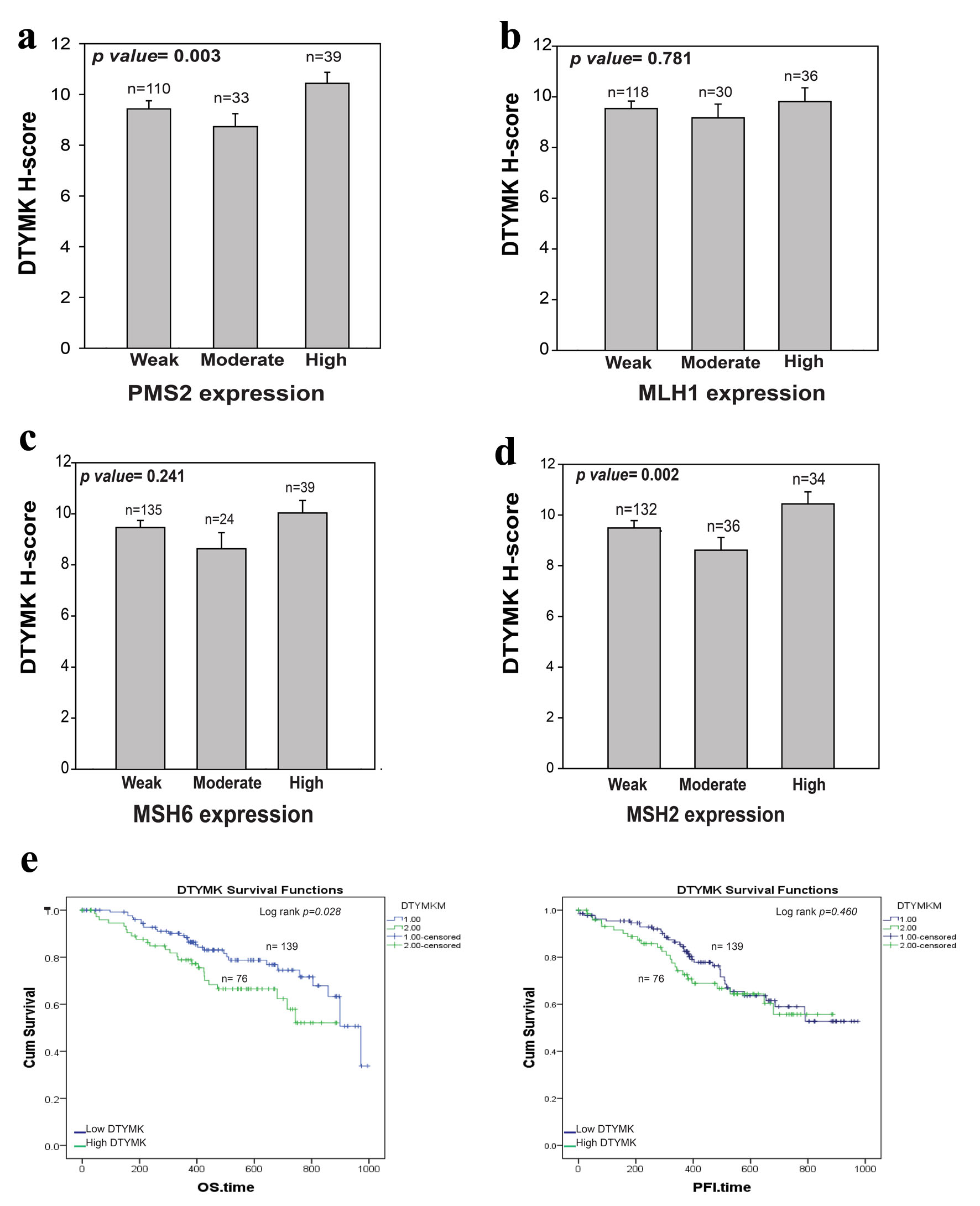 CRC is caused by germline mutations in the DNA MMR genes MSH2, MSH6, or MLH1. These mutations have an autosomal dominant inheritance pattern [22, 23]. PMS2 encodes a protein that is required for MMR; nevertheless, mutations in this gene have only been recorded in exceedingly rare situations [24-26]. In this study, we examined the correlation between the MMR proteins IHC results with DTYMK expression (Fig. 3a-d). We found that high DTYMK H-score is strongly associated with high level of PSM2 (P = 0.003) and MSH2 (P = 0.002), but not with MSH6 and MLH1. These results may indicate that co-expression level of DTYMK with PMS2 and MSH2 could work together in CRC patients.