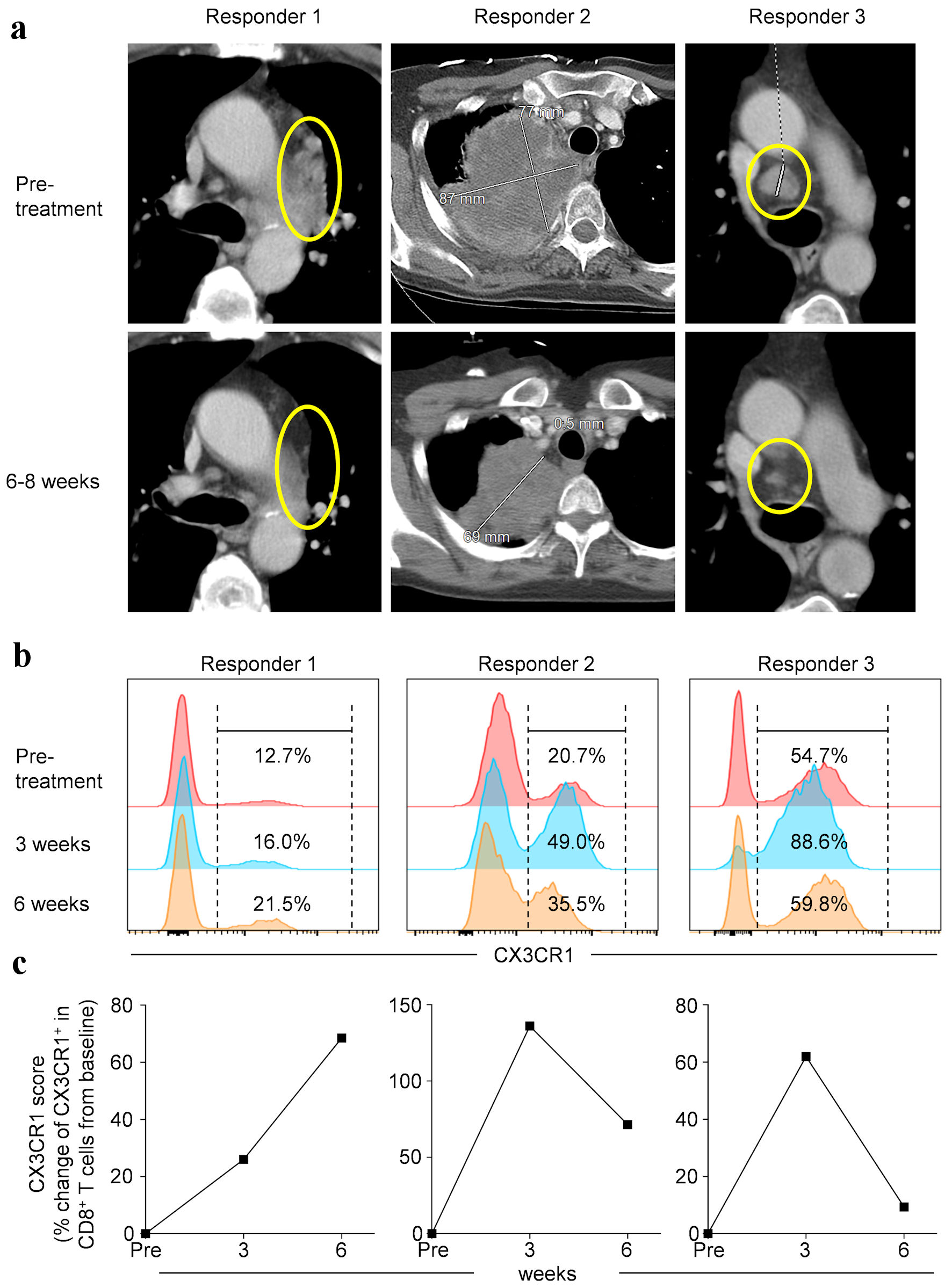 We have recently shown that expression of CX3CR1 on CD8+ T cells, marking T-cell differentiation [34], is linked to immunotherapy response in pre-clinical models and NSCLC patients treated with anti-PD-1/PD-L1 therapy [23]. In the study, a 20% rise in the CX3CR1 score (defined as the proportion of circulating CD8+ T cells expressing CX3CR1) from baseline predicted response to anti-PD-1/PD-L1 therapy as early as 3 weeks [23]. Therefore, in the current study we assessed the proportion of PB CD8+ T cells expressing CX3CR1 in the three patients who responded to treatment with pembrolizumab and calculated the CX3CR1 score in our patient cohort. We found that the PB CX3CR1+ CD8+ T cells substantially expanded at 3 weeks (Fig. 1b), resulting in at least 20% rise of the CX3CR1 score in all three responders (Fig. 1c). Although the CX3CR1 scores of the non-responders were not available for comparison, our findings indicate that response in these three patients is demonstrated not only by the imaging study (Fig. 1a) but also by circulating biomarker performance (Fig. 1b, c).